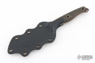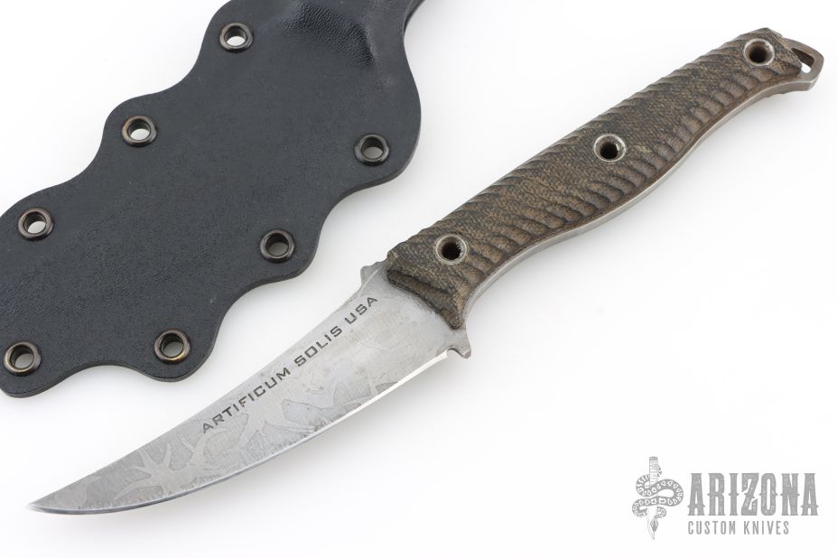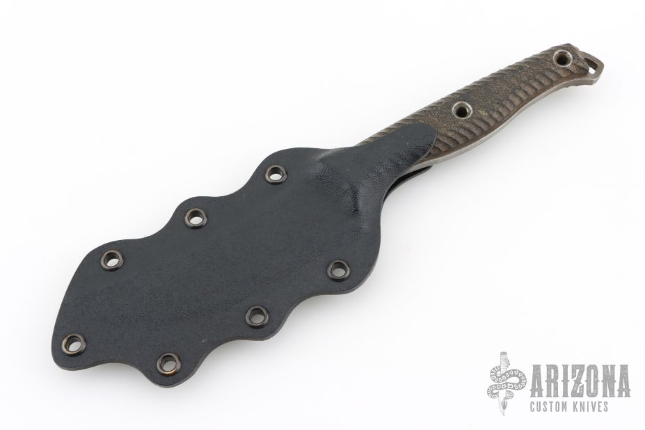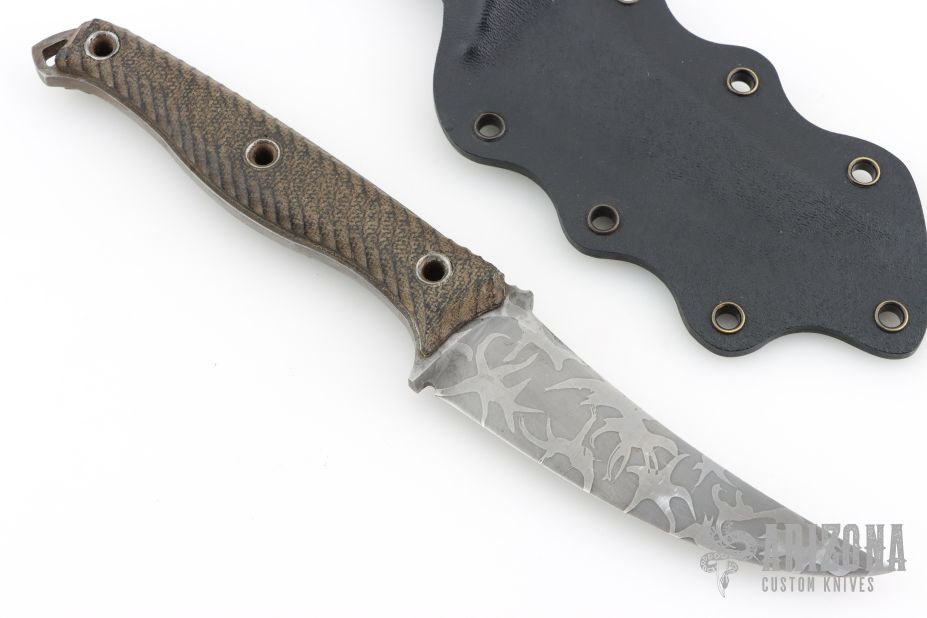 This knife is from the 1st run ever machine by RMJ Tactical and then was personally finished by Austin McGlaun.  This knife features an unswept acid etched blade with a full tang construction.  .188" Blade Stock.  1.123" Blade Depth.  The handle has a micarta scales.  Includes a Kydex sheath.  Has scuffs/scratches otherwise the knife is in good condition.