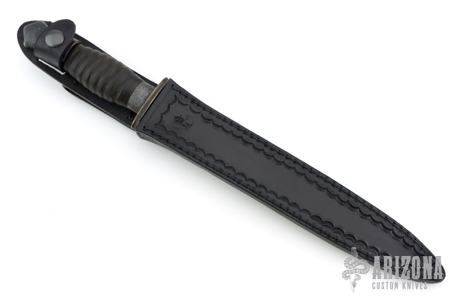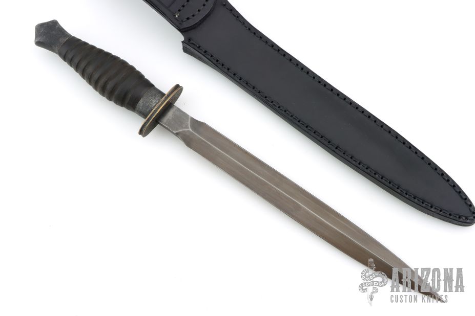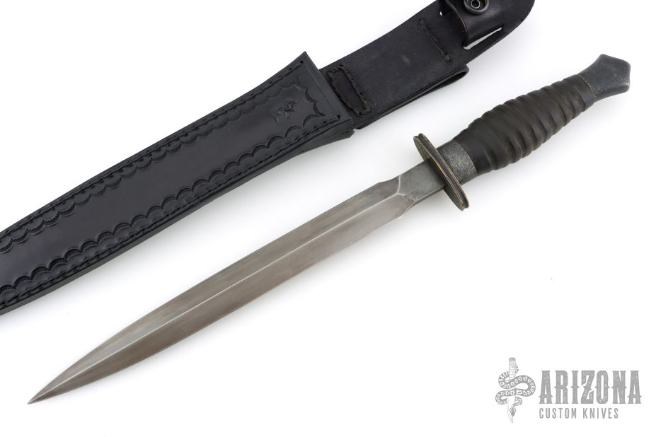 This Custom Elongated Fairbain-Sykes Dagger by Chuck Schuette has a forged and antiqued double edged blade with .205" blade stock and .946" blade depth, hidden tang construction. The handle has a fluted and antiqued brass guard, ribbed stacked leather grip with textured and antiqued aluminum collar and butt. Comes with a hand tooled black leather sheath. New from maker. Really nice recreation of an iconic dagger!