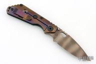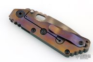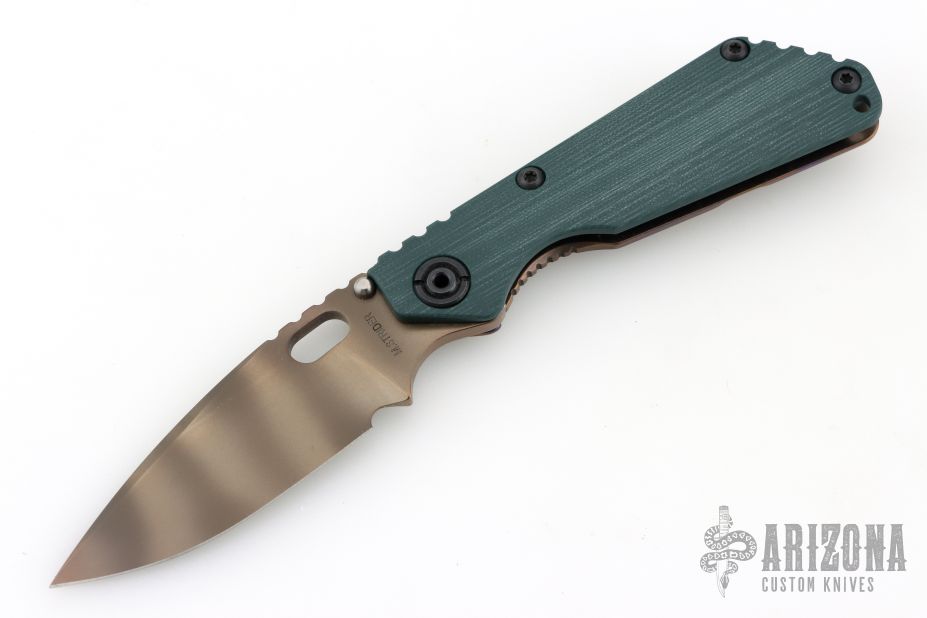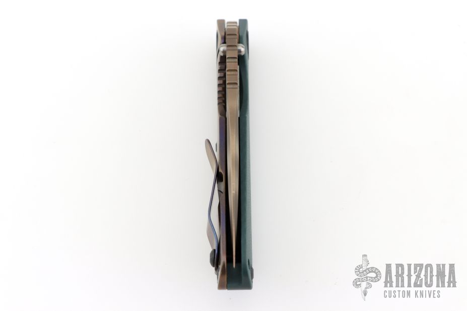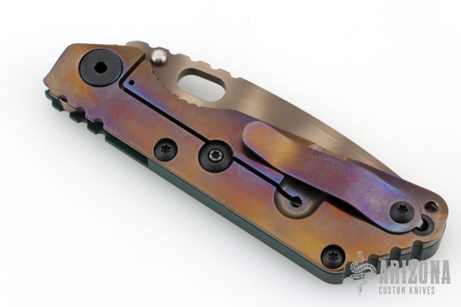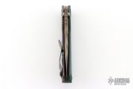 This SnG CC by Strider Knives features a ghost stripe blade and smooth forest green G-10 with a heat colored titanium frame and tip up clip. Notches on thumbrest, rear of handle, and lockup. Includes Hinderer "Lock Bar Stabilizer" for maximum reverse lock retention. Has black hardware. Excellent condition.