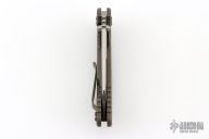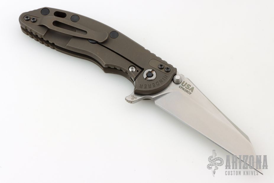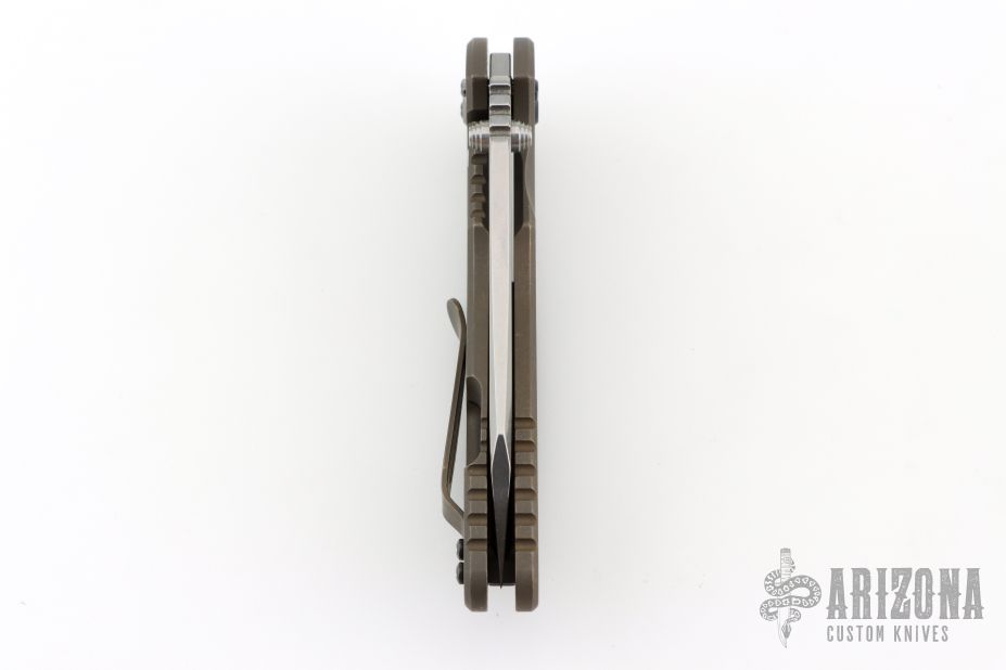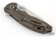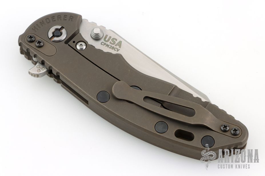 This 3.5" XM-18 from Hinderer Knives has a stonewashed finish wharncliffe blade with notched thumbrest and flipper. The handle has a smooth bronze stonwash finished cover with a battle bronze titanium frame and matching titanium pocket clip. Dual thumb studs and notched thumbrest, anodized titanium backspacer. Black hardware and pivot. Reversible pocket clip. Strong lock up and nice detent. Comes with original box, original black G10 scale, extra washers and card. Excellent condition.