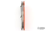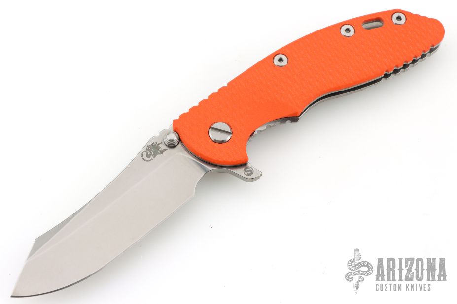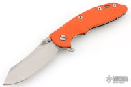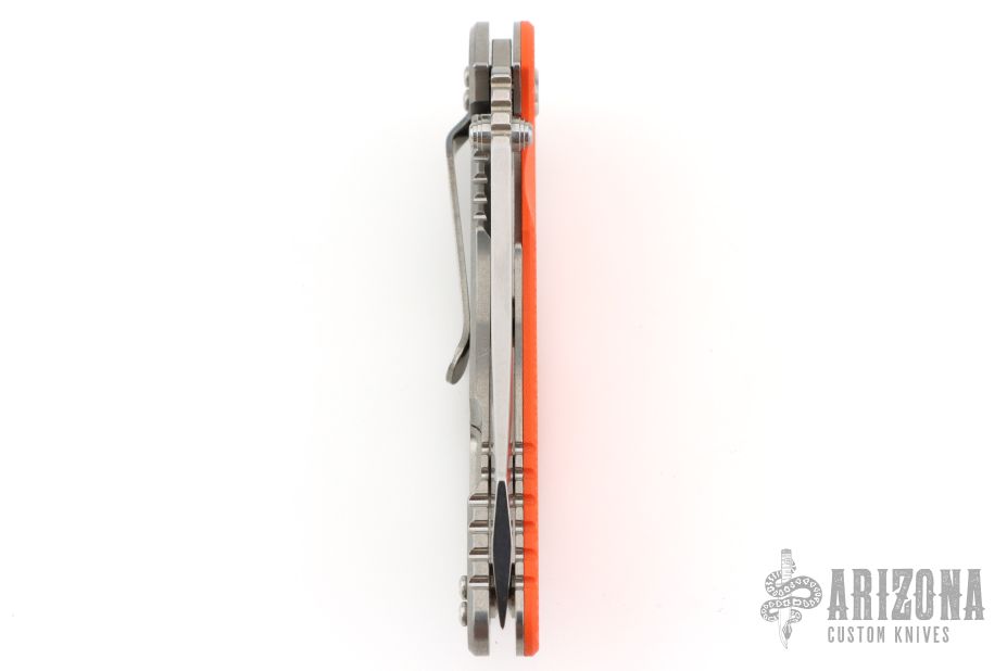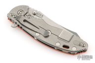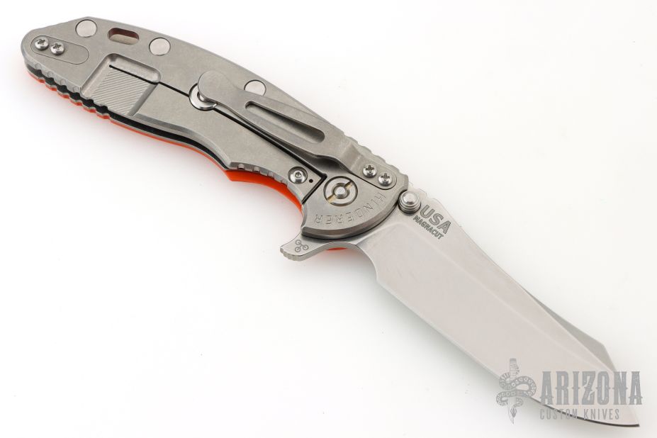 This XM-18 Skinny by Rick Hinderer features a stonewash finished blade with notched thumbrest and flipper. The handle has an orange G10 cover, stonewash finished titanium frame, with a matching tip up or down reversible titanium clip, filler tab, and lanyard hole at the butt. Comes with original box, card, and extra washers. Excellent condition.