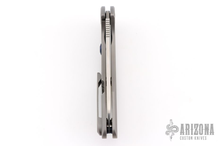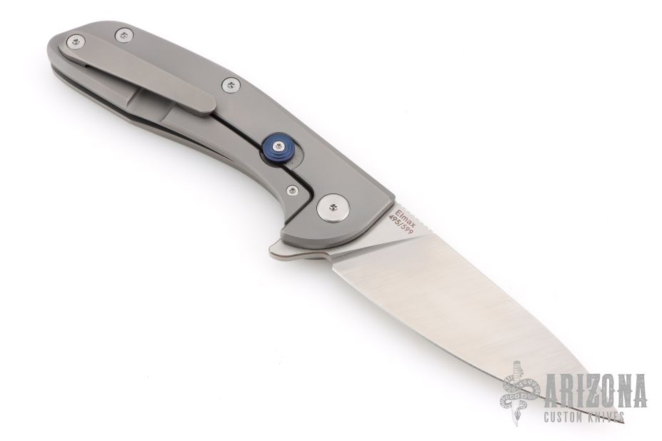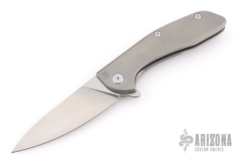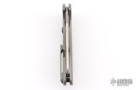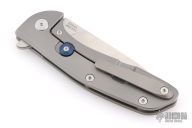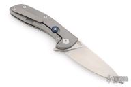 This S571 Pro by RealSteel features a satin finished blade with notched thumbrest and flipper. The handle has a bead blasted titanium frame with matching tip up clip, anodized titanium overtravel stop that also slides forward to lock the blade in the open position. Comes with original box and papers dated Jan 2017 #495/599. Rides on bearings. Excellent condition.