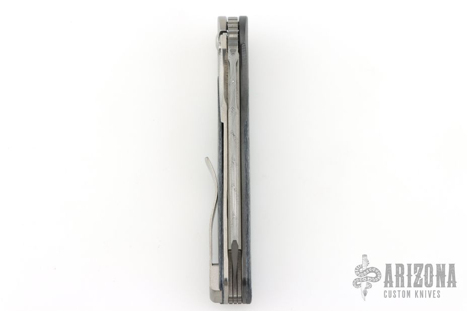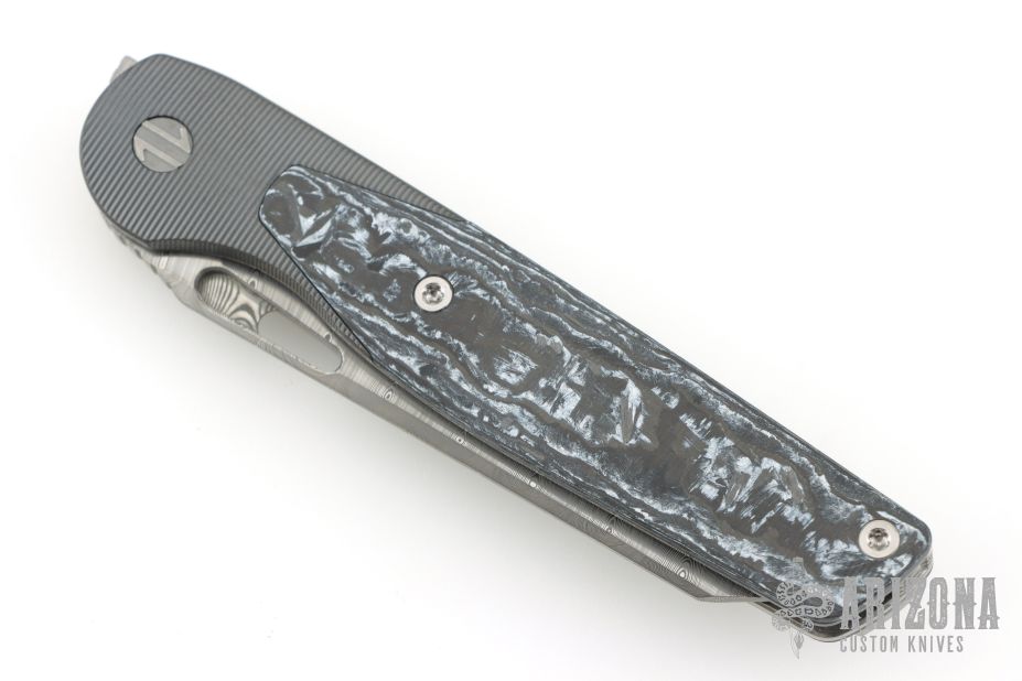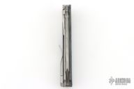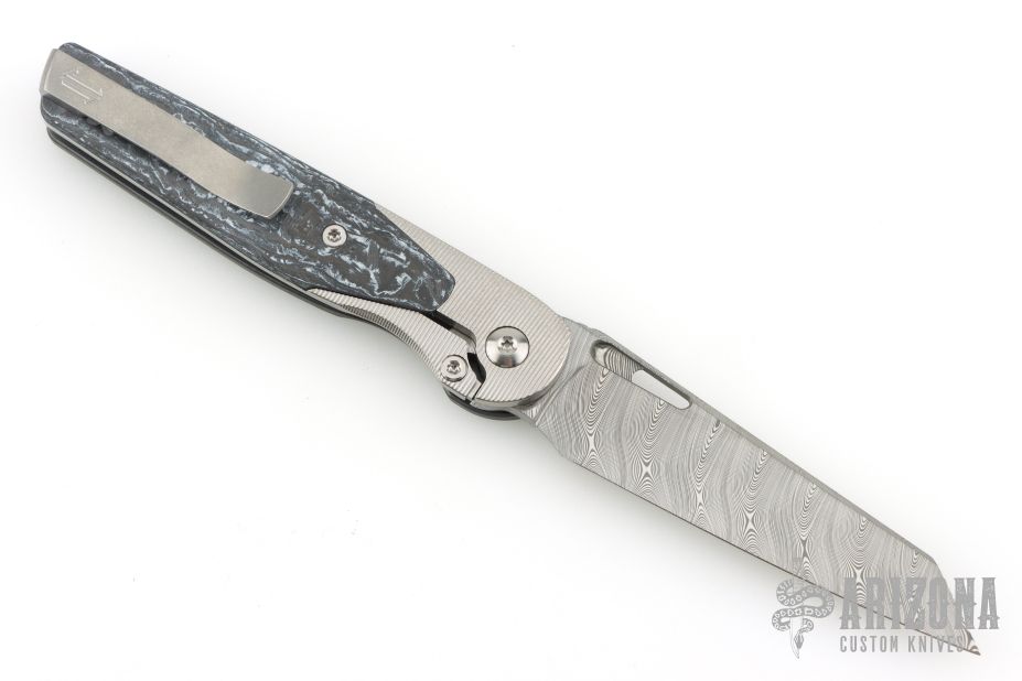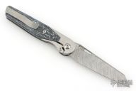 This Cortex by Brown Knives features a Damasteel blade with notched thumbrest and flipper. The handle has a milled and stonewashed Zirconium frame with integral bolsters, inlaid white carbon fiber scales, notched titanium backspacer, lock-side, and tip up clip with hidden screws. Rides on bearings, nice detent, lockup and blade seating. Comes with original box and COA #128. Excellent condition.