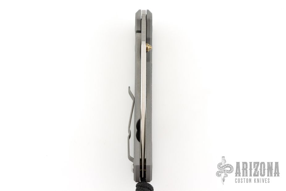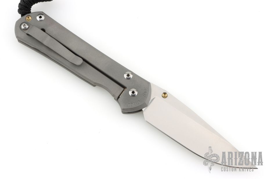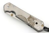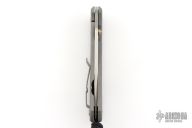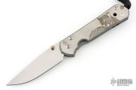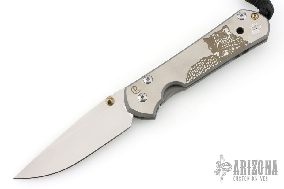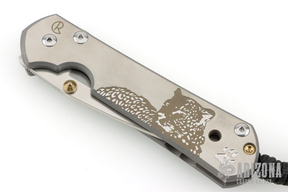 This Large Sebenza 21 CGG "Leopard", by Chris Reeve Knives features a stonewashed blade with single anodized titanium thumbstud, notched thumbrest. The frame is bead blasted titanium with matching tip up clip; the front scale is satin finished with the computer generated graphic. Nice detent, lockup and blade seating. Comes with original box, cloth, tool, lube, leather slip sheath, papers, and COA dated APR 27, 2017. Excellent condition.