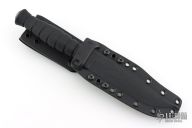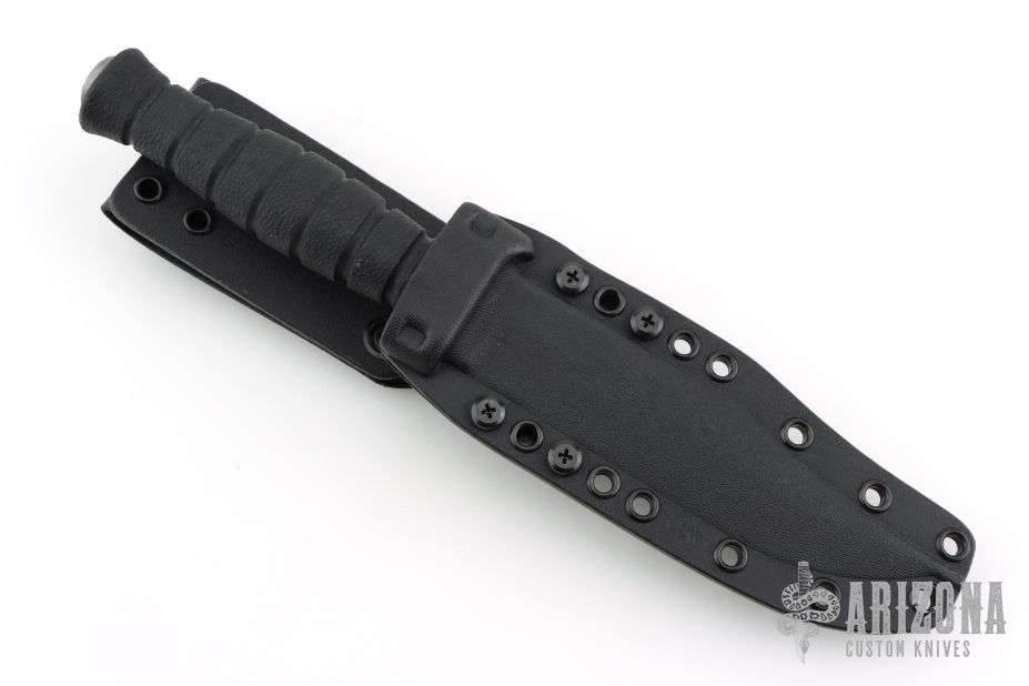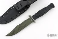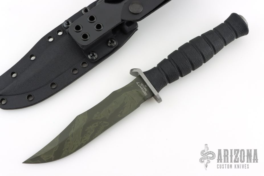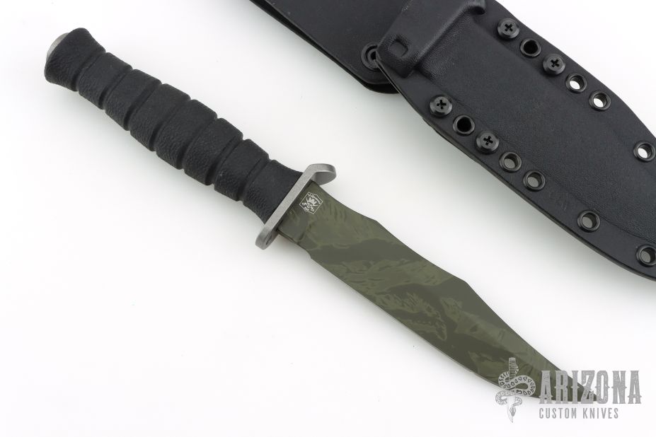 The M320V by Defiant 7 features a tiger stripe cerakote blade with false top edge, .191" blade stock and 1.231" blade depth, hidden tang construction. The handle has a stonewashed titanium guard with a notched thumbrest, injection molded grip. Comes with a black kydex sheath by Chattanooga Leather Works, and original box. New from maker!