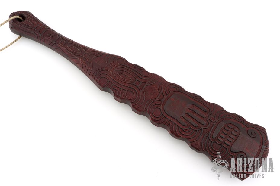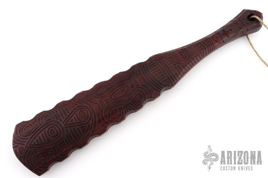 Straight from Ryan's shop is his War Stick, similar to the Macuahuitl (don't ask us how to pronounce it) war club coming in at 16.5 inches long! Perfect for all your smashing and bashing needs, his War Stick is constructed from Hickory with a red stained finish and a Death Cult motif down the length of the body. The main body tapers to a more than generous handle with a pommel for a secure grip. These War Sticks are not for the feint of heart!