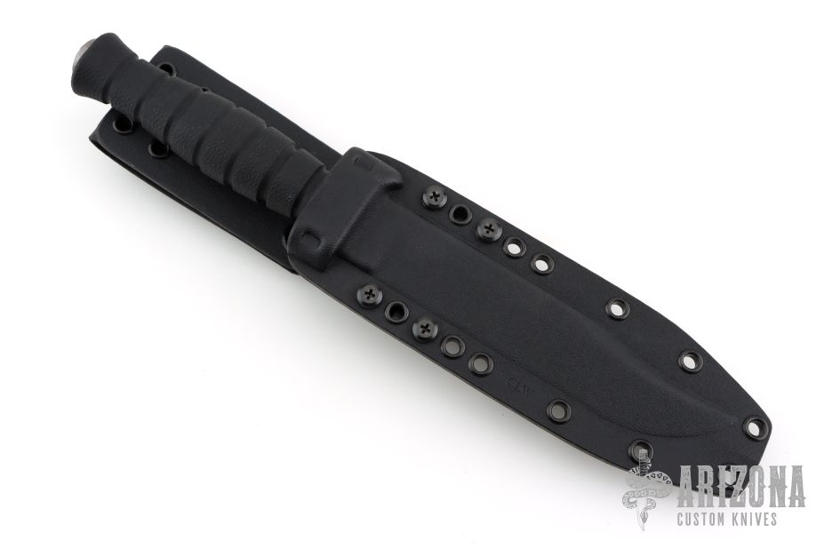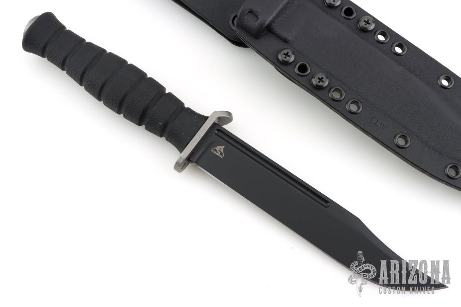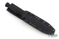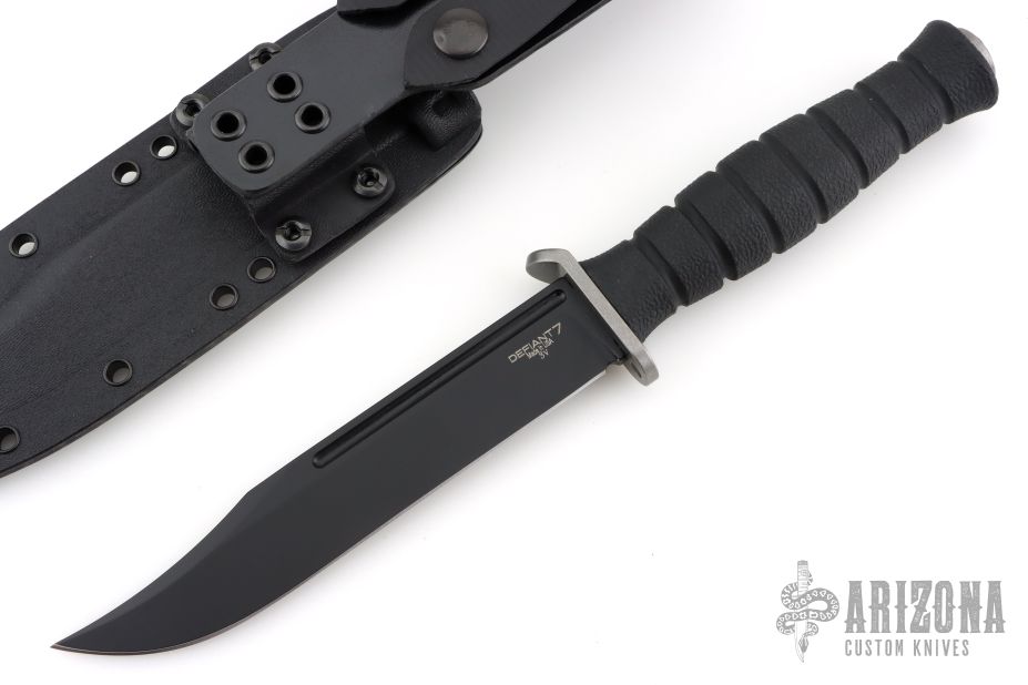 The M320E by Defiant 7 features a black cerakote blade with false top edge and fullers, .189" blade stock and 1.136" blade depth, hidden tang construction. The handle has a stonewashed titanium guard with a notched thumbrest, injection molded grip. Comes with a black kydex sheath by Chattanooga Leather Works, and original box. New from maker!