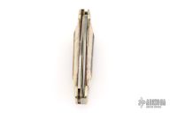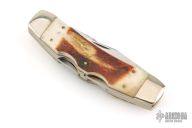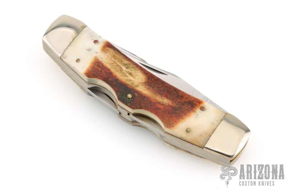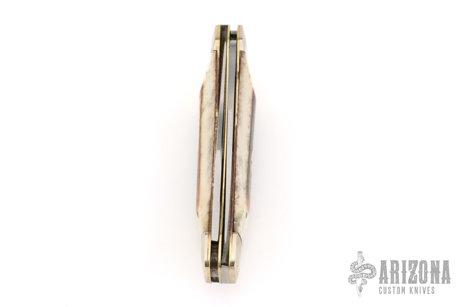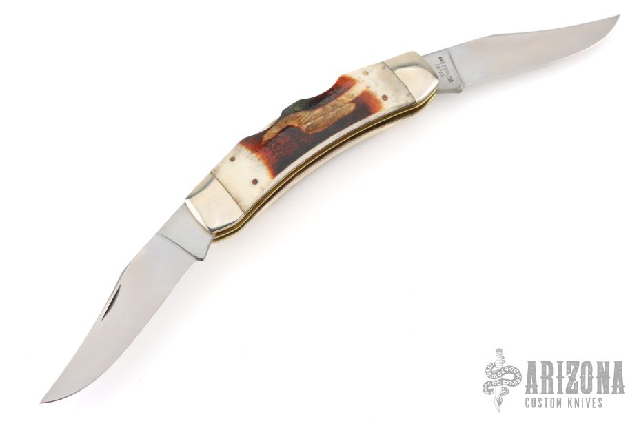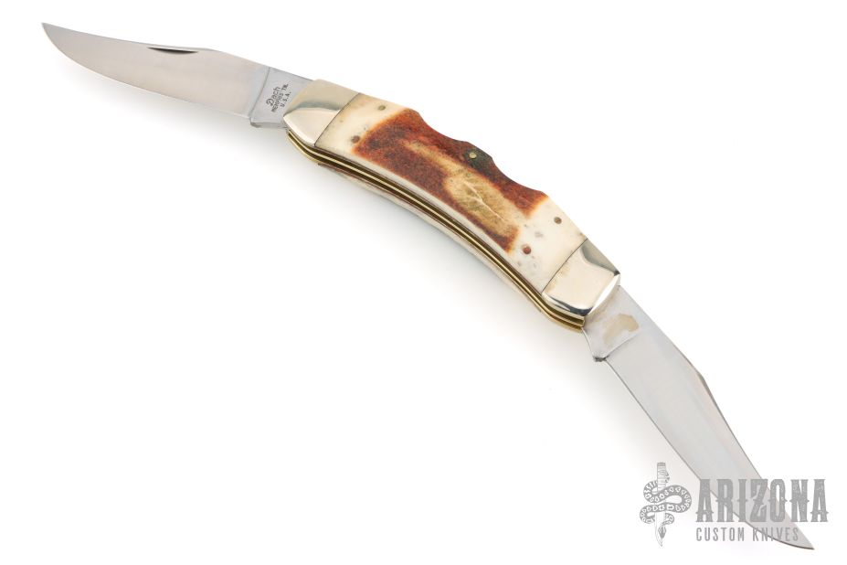 This knife by Parker-Amai features two satin finished blades with nail nicks. The handle has nickel silver bolsters, smooth bone covers, brass/pins liners and stainless steel springs. Comes in original box. Has some light scratches, otherwise excellent condition.