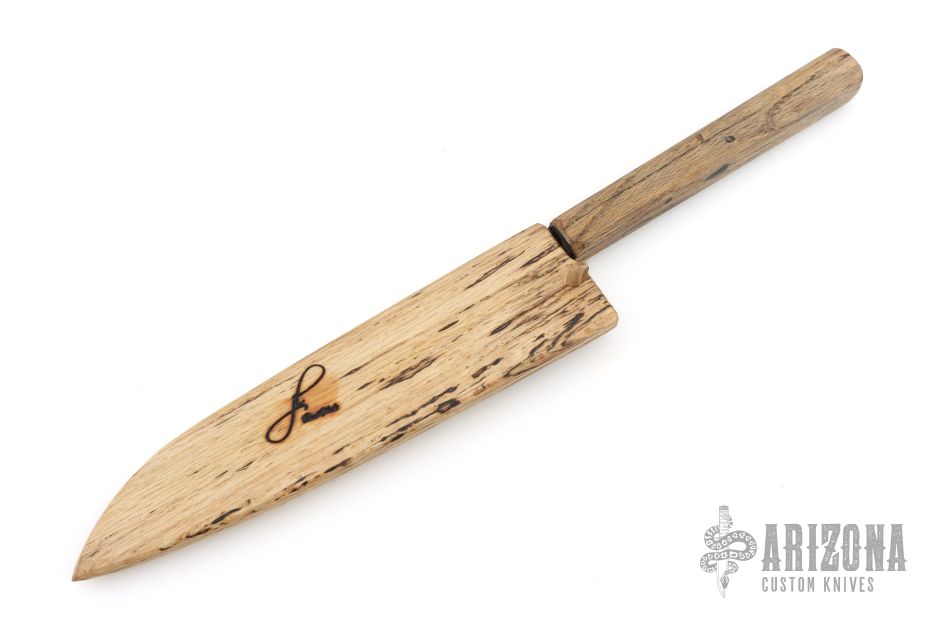 The handle is crafted from spalted oak, showcasing unique natural patterning, and is paired with a matching saya for protection and presentation.
