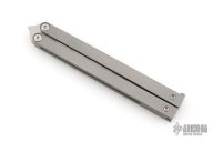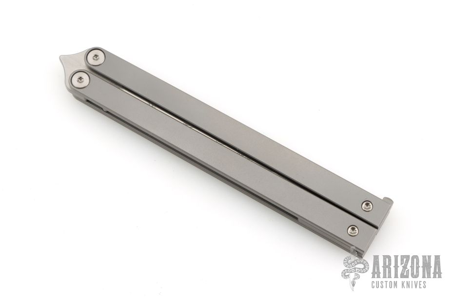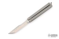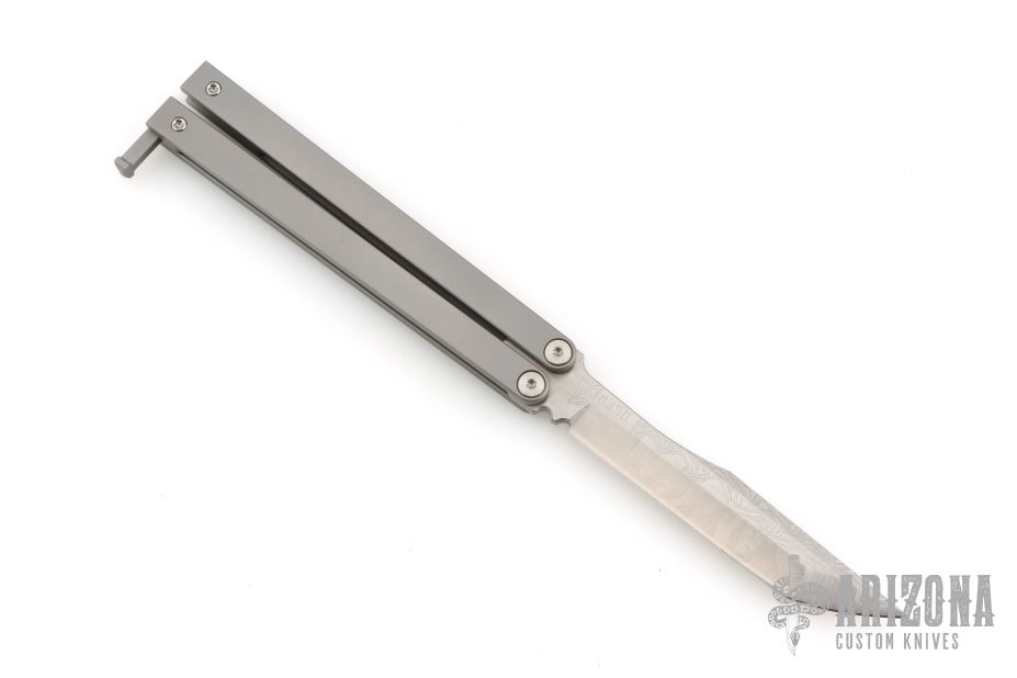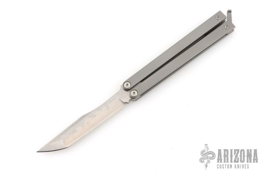 The Michael Zieba Balisong is a custom butterfly knife available at a production price point. It features his trademark harpoon drop point spine profile with a tanto cutting edge so that it will fit into the slender frame. The blade has a laser engraved San Mai pattern. The titanium handles bead blast finished with matching spacers. The bearing pivots lead to very smooth flipping action and its proper balance allows you to perform any trick you're daring enough to try. This butterfly knife is a fantastic representation of Mike as both a designer and a knifemaker. It's precise, stylish, different from the rest, and is both new age and classic. Handmade in the USA. Comes with a zippered case and maker's card. Excellent condition.
