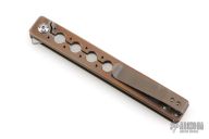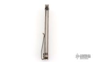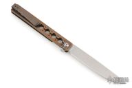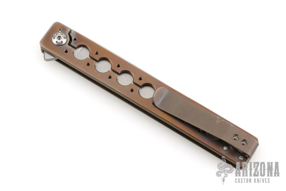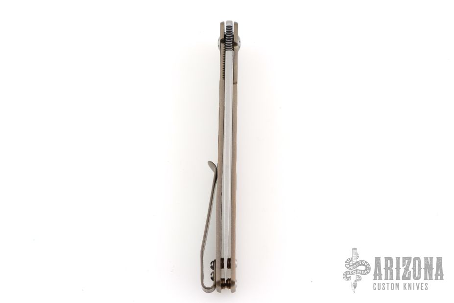This Large Miscreant by Brad Zinker features a stonewashed drop point blade with notched thumbrest and flipper. The handle has a tumbled and anodized titanium frame with matching tip up clip. Rides on bearings, nice detent, lockup and blade seating. Comes with maker's zippered case. Has some light scuffs and scratches on the body/clip. Great overall condition.