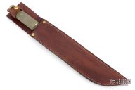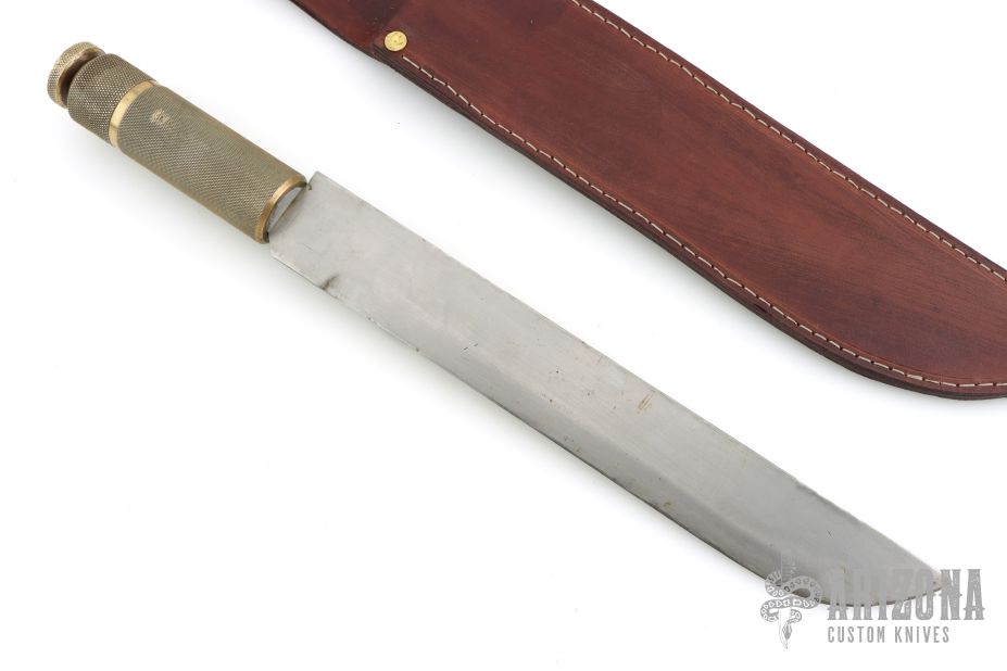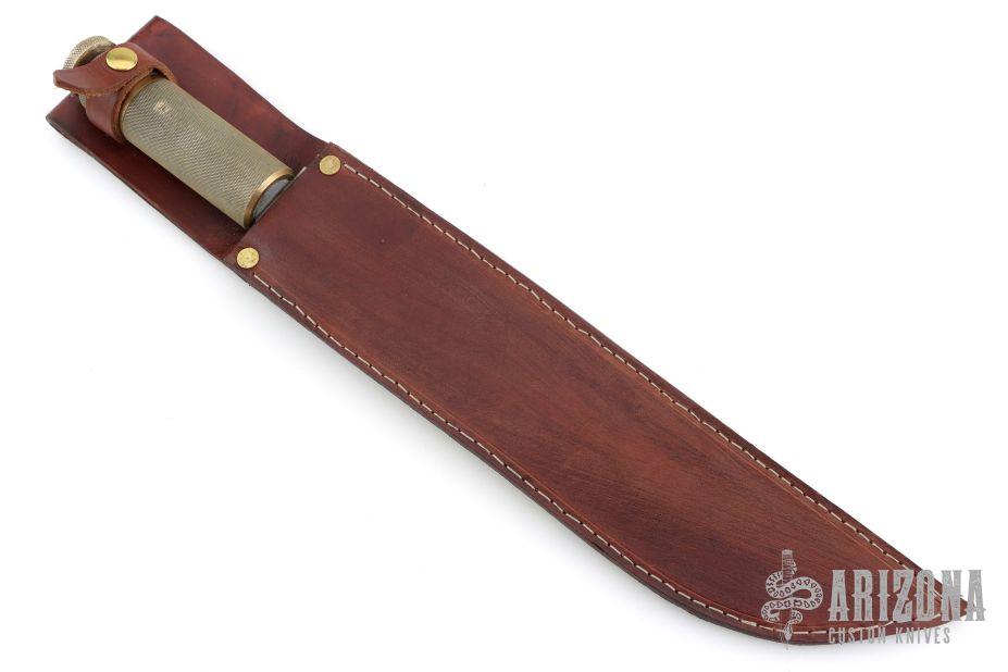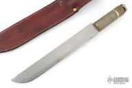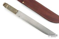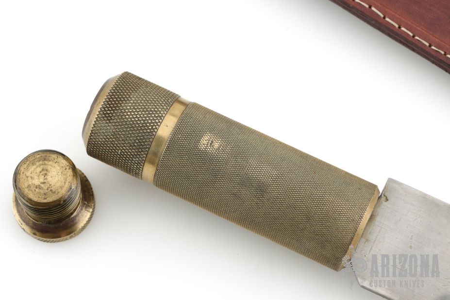 This knife features a satin finished blade with .128" blade stock and 1.511" blade depth, hidden/hollow tang construction. The handle has a knurled brass grip and a knurled brass removable butt. Comes with a brown leather sheath. Has scratches and dings, otherwise good user condition.
