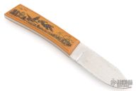 This knife by Bob Oleson features a mirror polished blade with .184" blade stock and .863" blade depth, full tang construction. The handle has vintage paper micarta scales with brass pins and nice scrimshaw. Has a couple light scuffs/scratches, excellent condition otherwise.