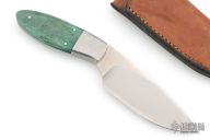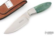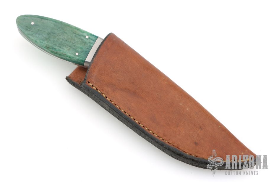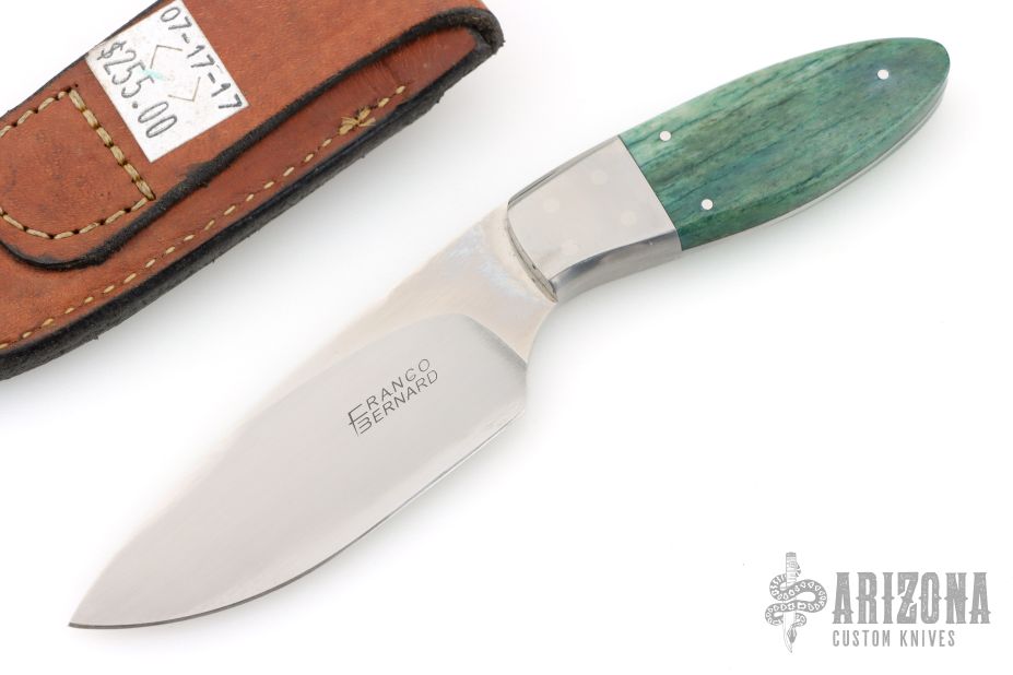 This knife appears to be a collaboration knife between Arno Bernard, and a maker named Franco. Please notify us if you know who the other maker is. The blade features a hand rub satin finish, with full tang construction, .097" blade stock, and 1.08" blade depth. The handle has steel bolsters, and pinned dyed bone covers. Comes with a leather belt sheath. Has a couple light scratches, excellent condition.
