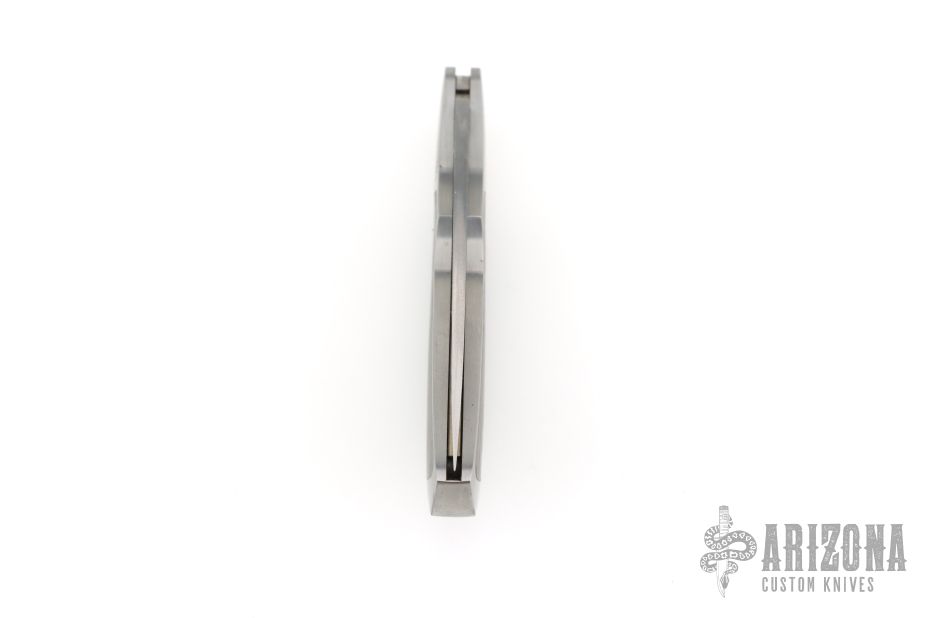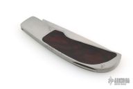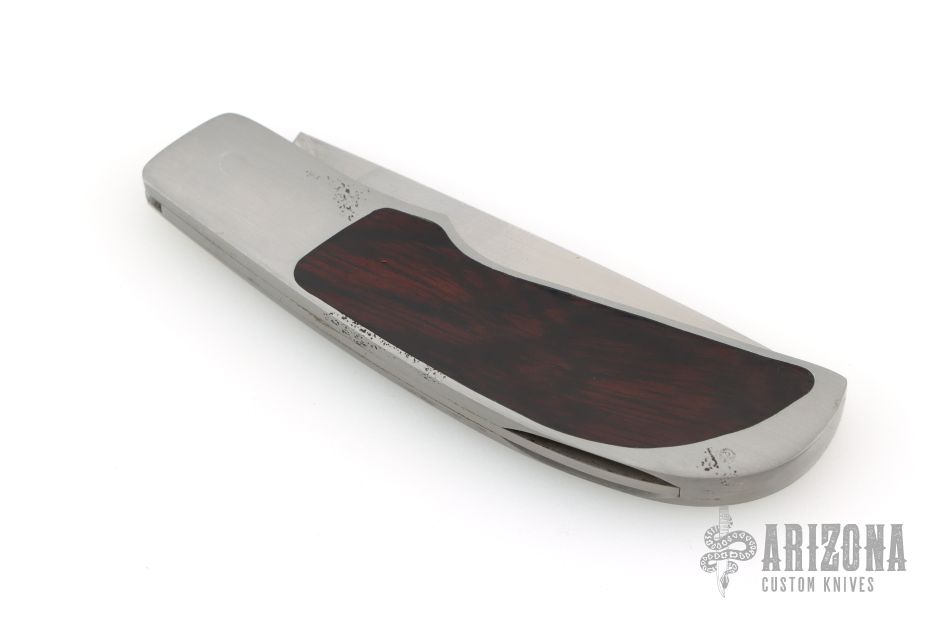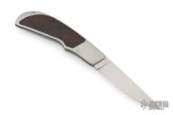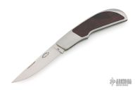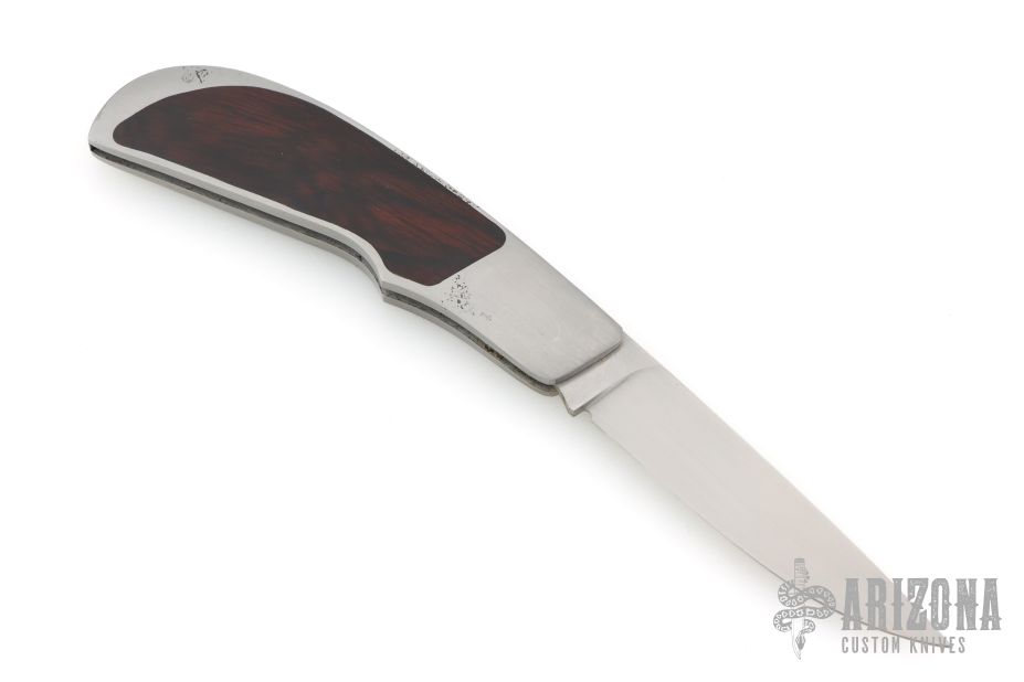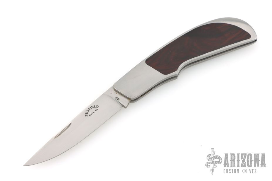 This Lockback folder by Jack Busfield features a hand rub satin finished drop point blade with nail nick. The handle has steel covers, and desert ironwood inlays, steel lockbar and backspacer. Comes with a felt pouch. Marked 00 in the ricasso of the blade.