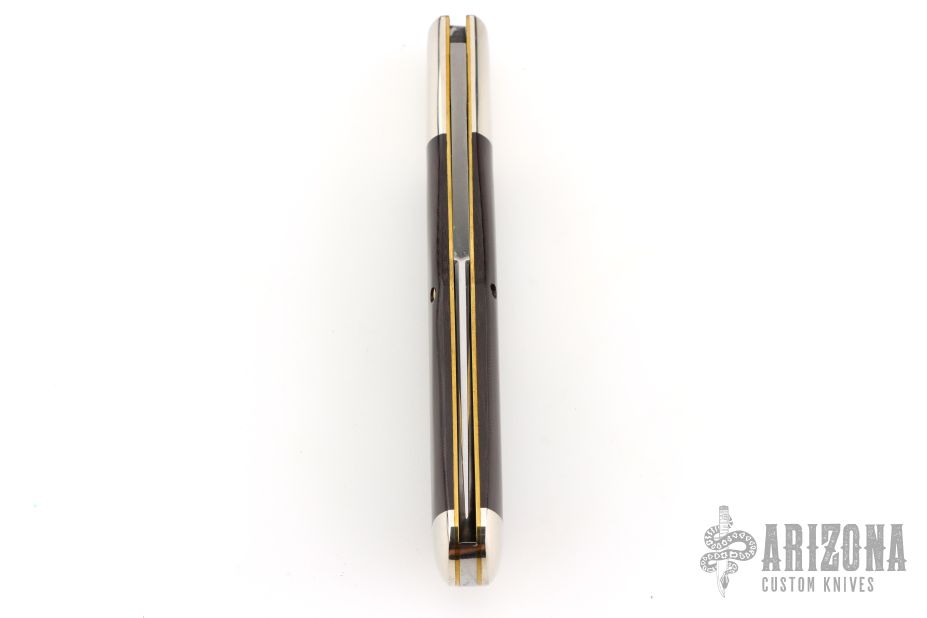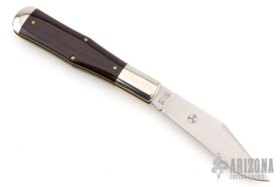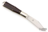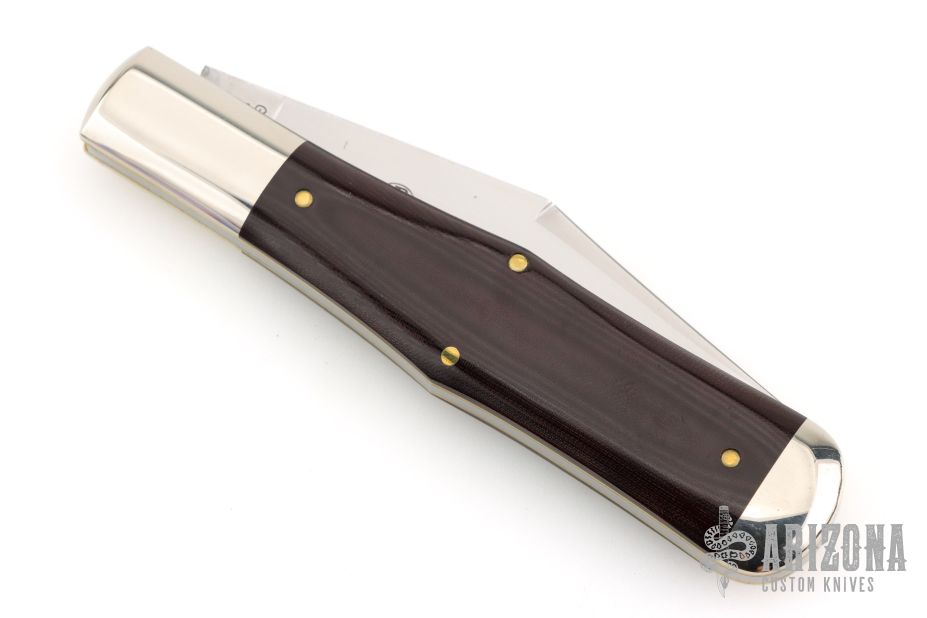 This knife features a satin finished clip point blade with a single nail nick.  The handle features nickel silver bolsters, maroon linen micarta covers and brass liners.  Flush half-stop.  Includes the original tube, button and paper. Has some light scratches, excellent condition.