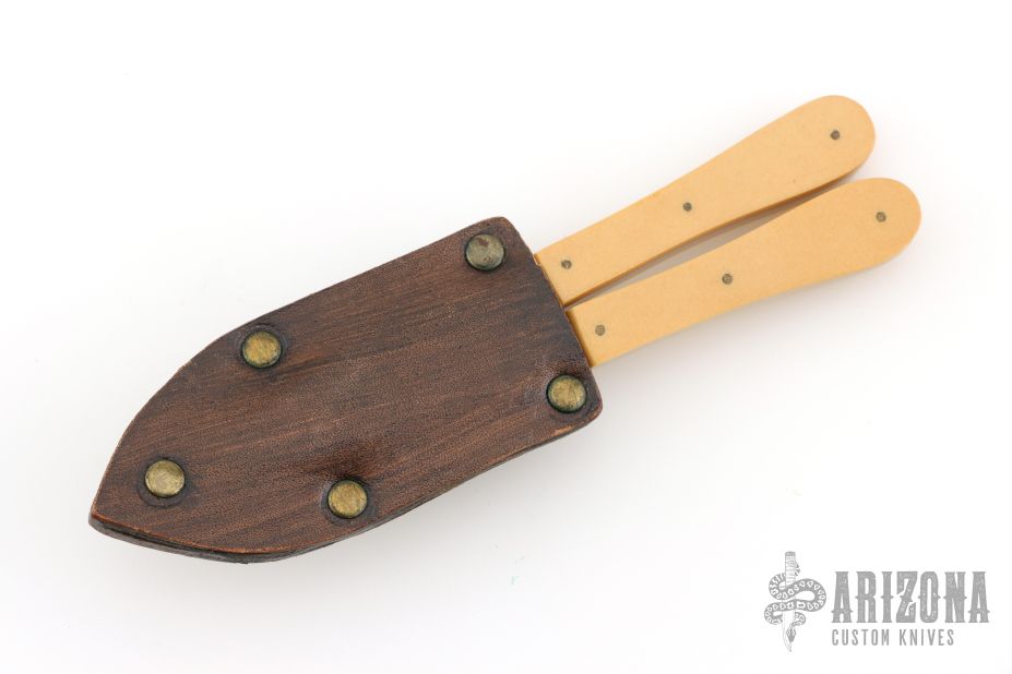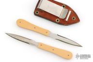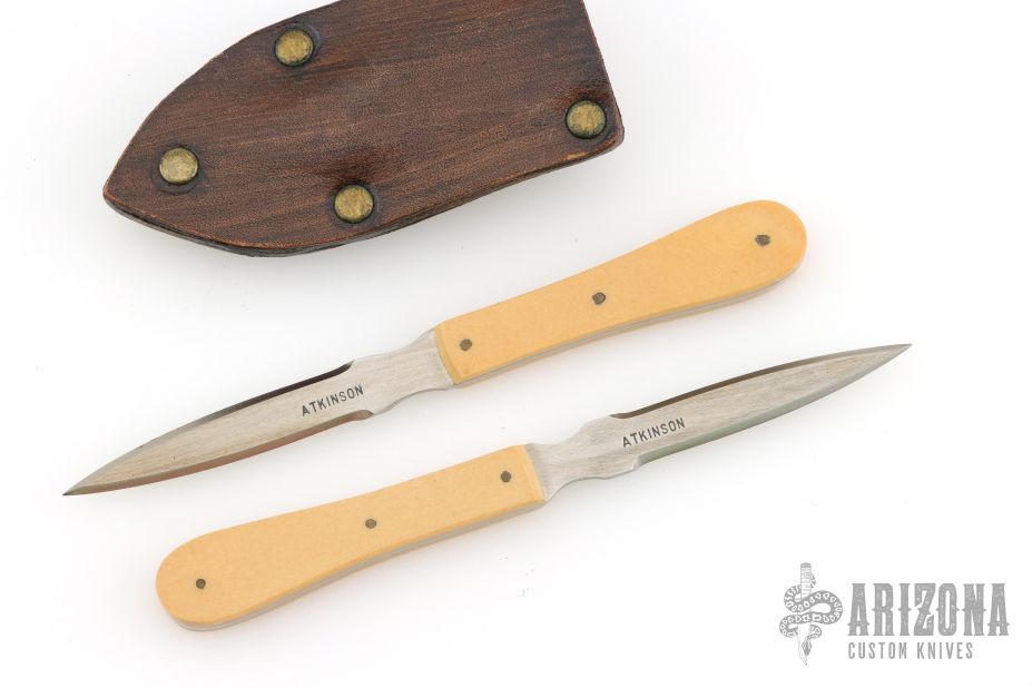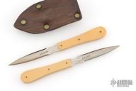 These Toothpick Daggers by Dick Atkinson features a satin finished double edged blades, .082" blade stock and .425" blade depth, full tang construction. The handle has yellow paper micarta scales. Comes with a brown leather sheath with metal clip that holds both knives. Excellent condition.