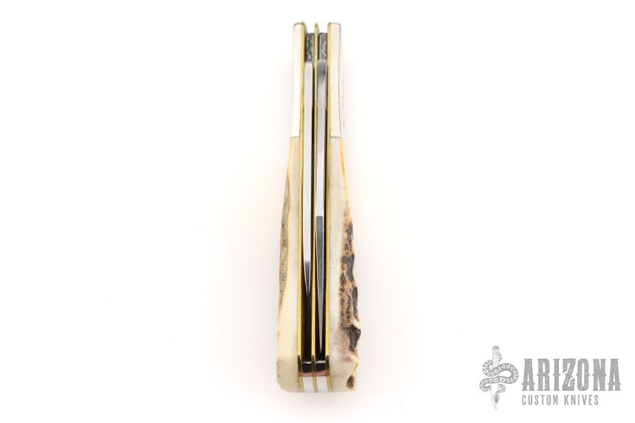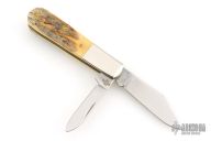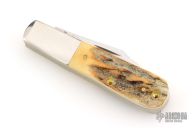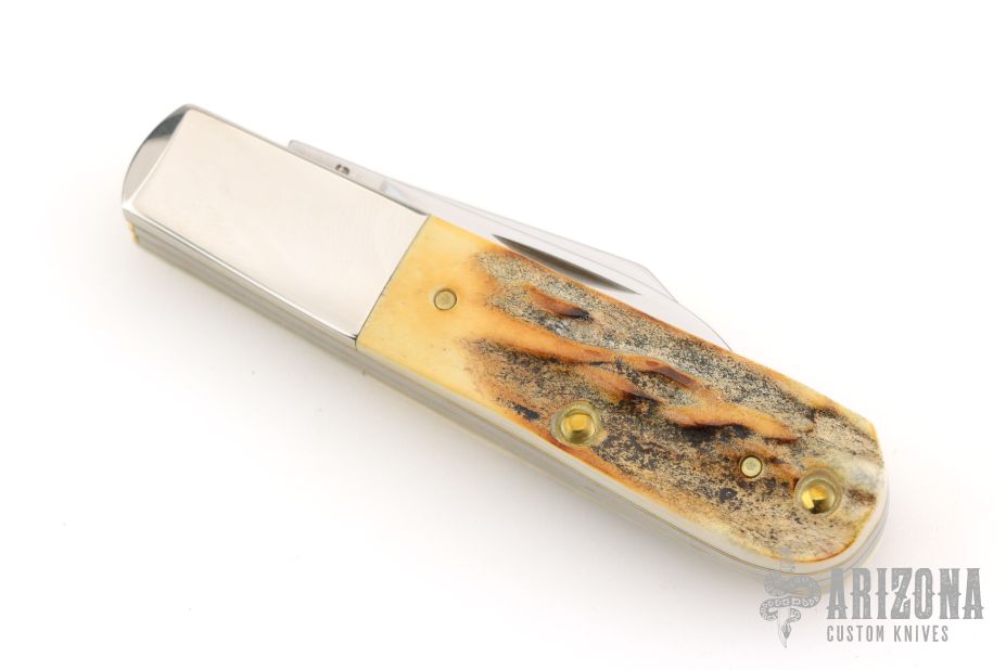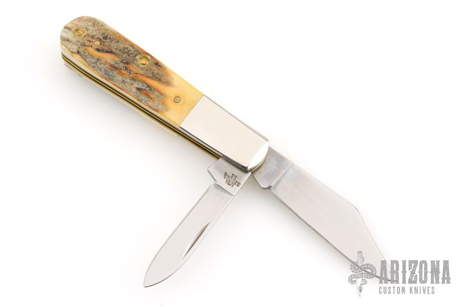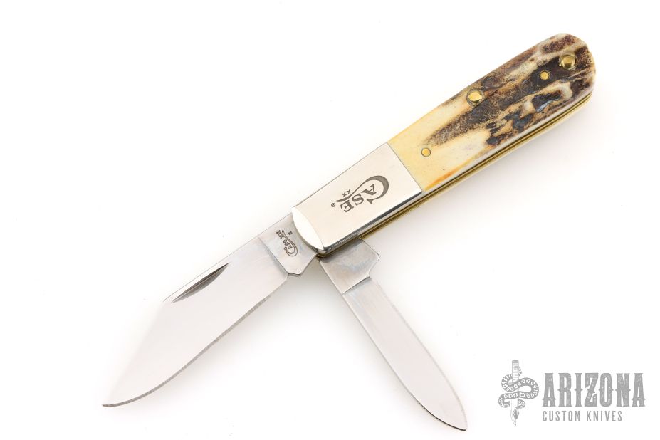 This two blade Barlow by Case features two mirror polished blades both with nail nicks. The handle has stag covers, nickel silver bolsters, brass liners and stainless steel springs. Has half-stops. Comes with original box and paper. Excellent condition. 2019