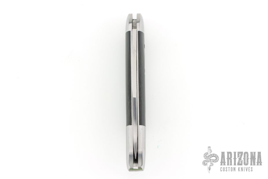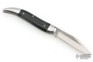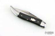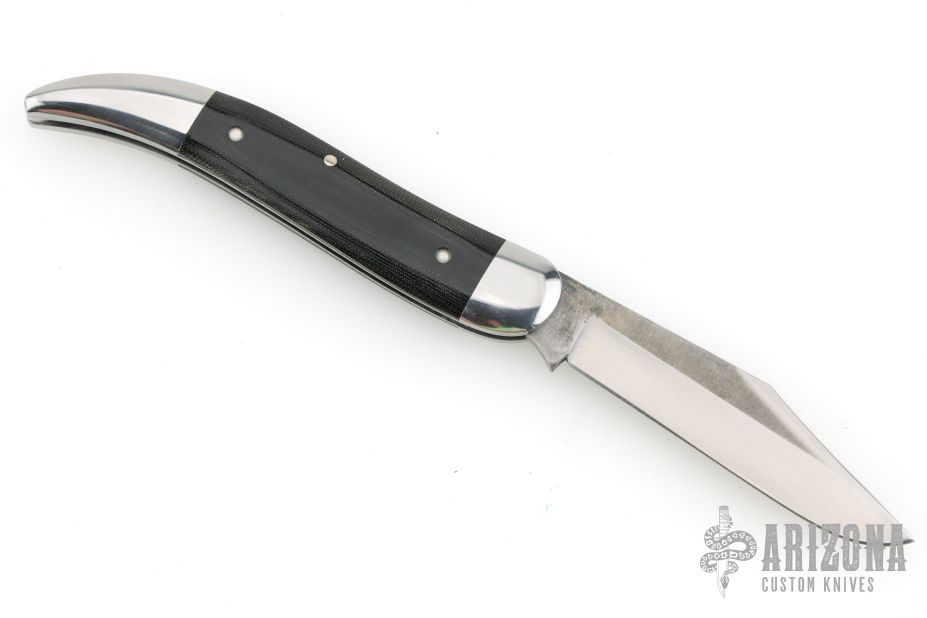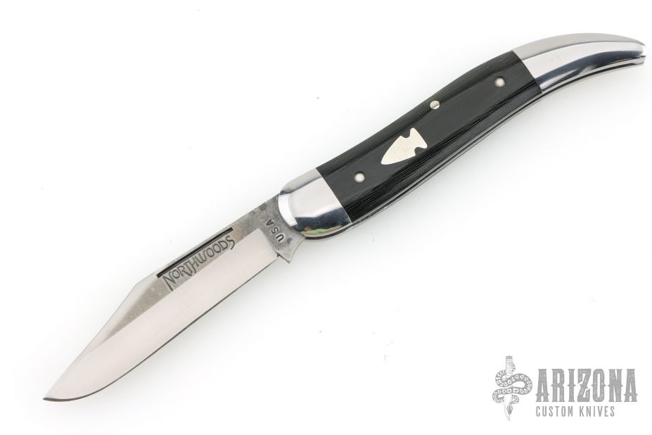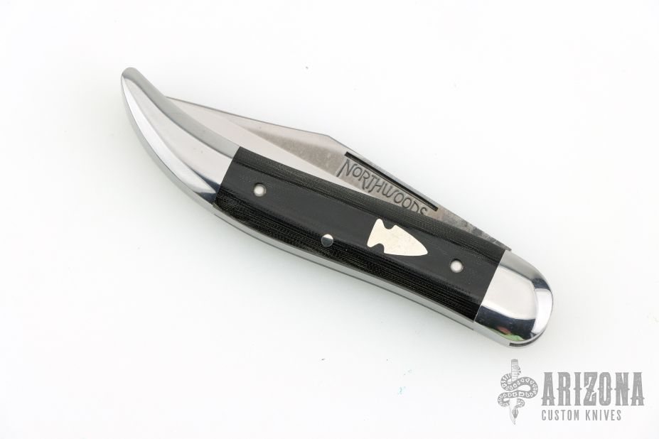 This Coolidge Jack from Northwoods Knives features a clip point blade.  The handle has stainless bolsters and liners, nickel silver shield complimented by black linen micarta covers. Comes with a brown leather slip sheath and a Copper coin. Has some light scratches, excellent condition otherwise.