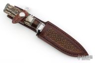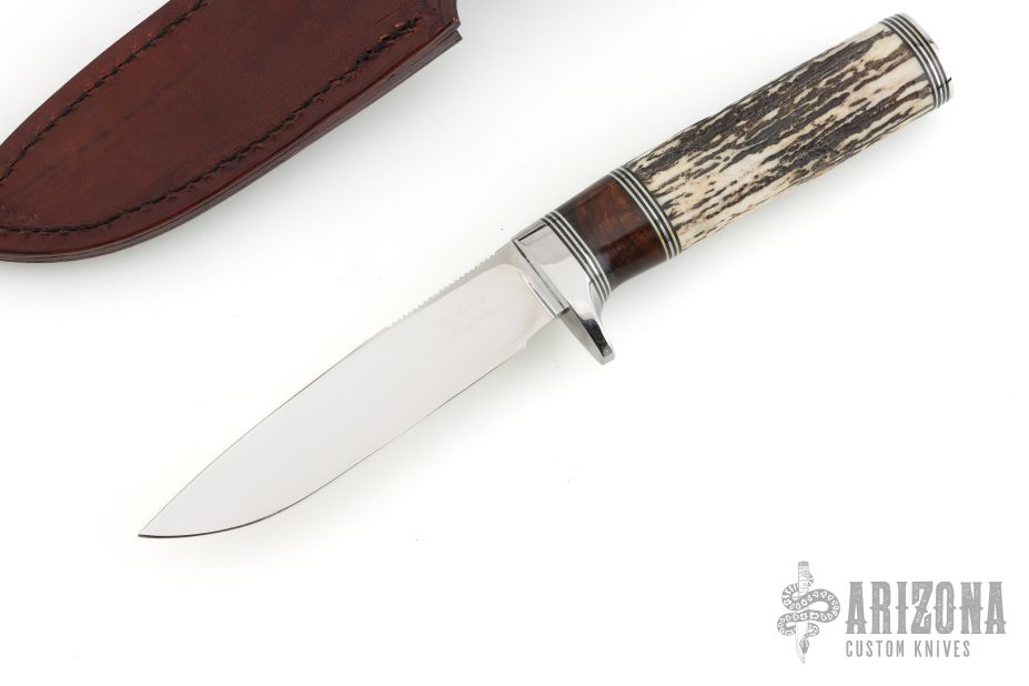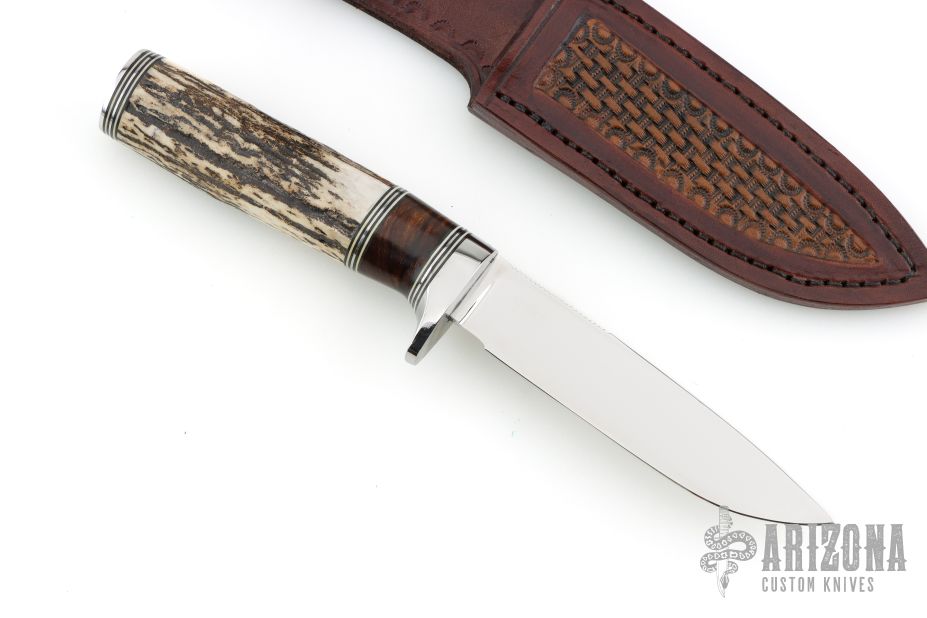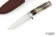 This knife features by George Trout features a drop point blade with a mirror polish finish, notched thumb rest, .144" blade stock, .98" blade depth, and hidden tang construction. The handle features a polished stainless guard, white/black/steel/wood spacers, with stag grip and steel pommel. Comes with a leather belt sheath. Has a couple light scratches, otherwise Excellent condition.