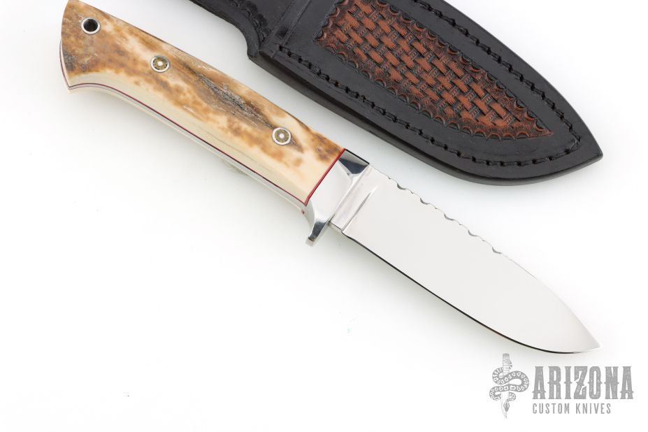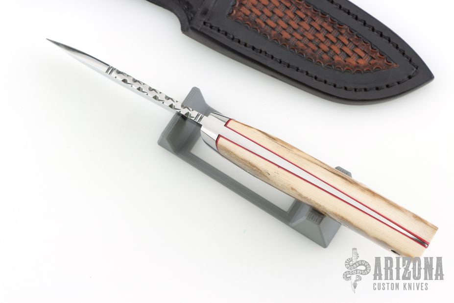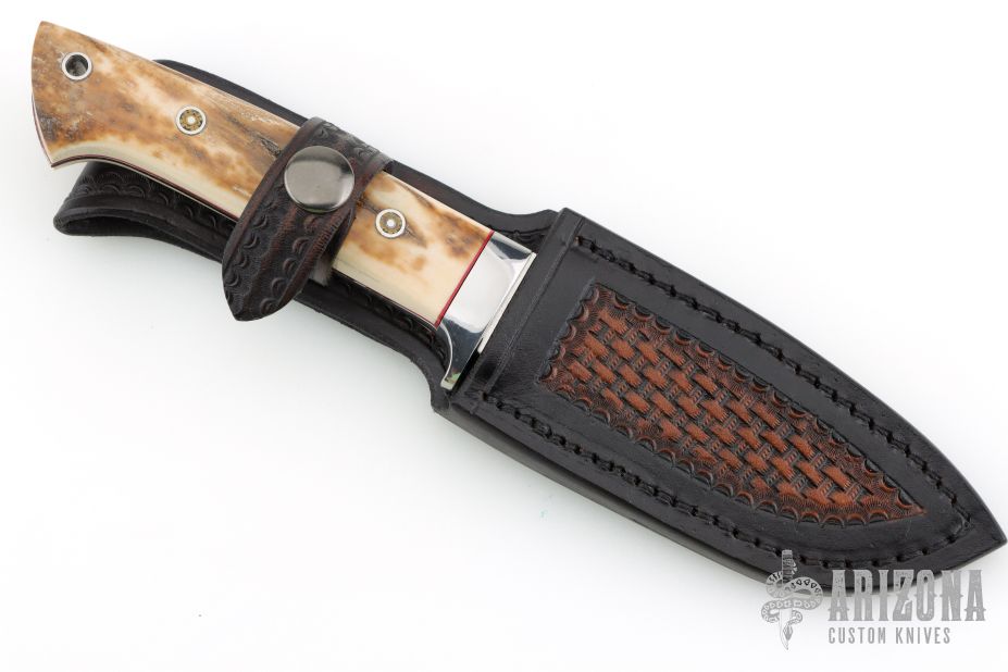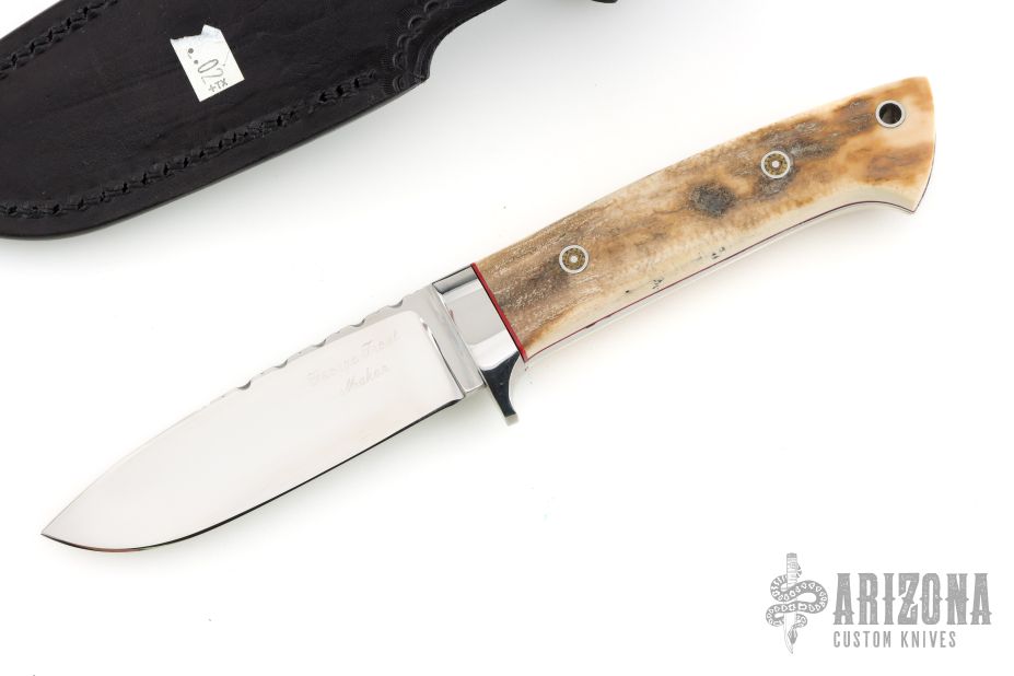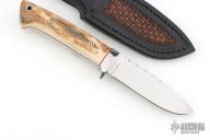 This Drop Point Hunter by George Trout features a mirror polished blade with a fileworked spine, .172" blade stock and 1.037" blade depth, full tapered tang construction. The handle has a stainless steel guard, mammoth ivory scales with red liners, mosaic pins and a lanyard hole at the butt. Comes with a hand tooled brown leather sheath. Excellent condition.