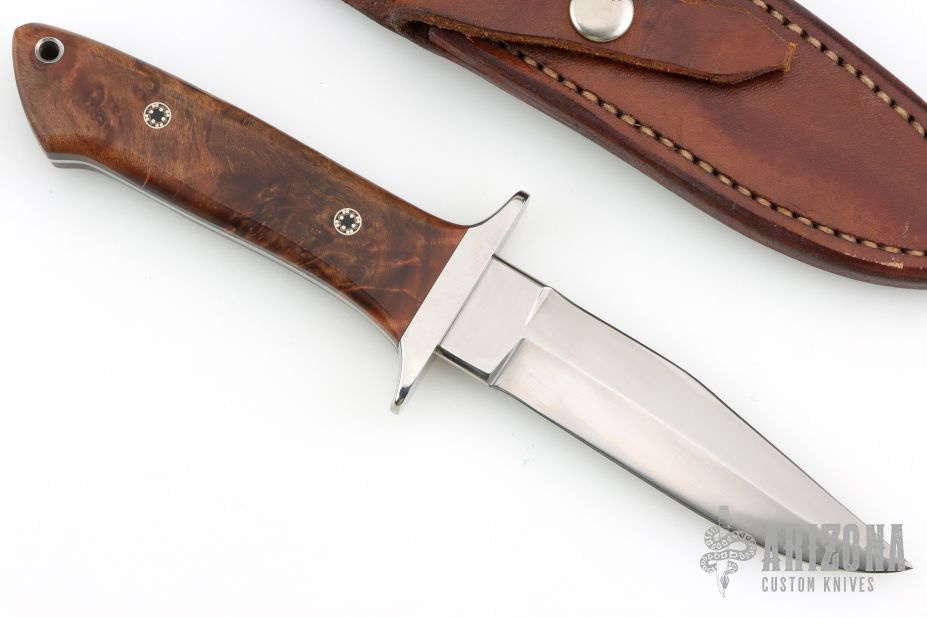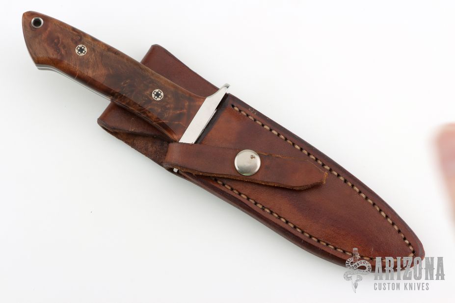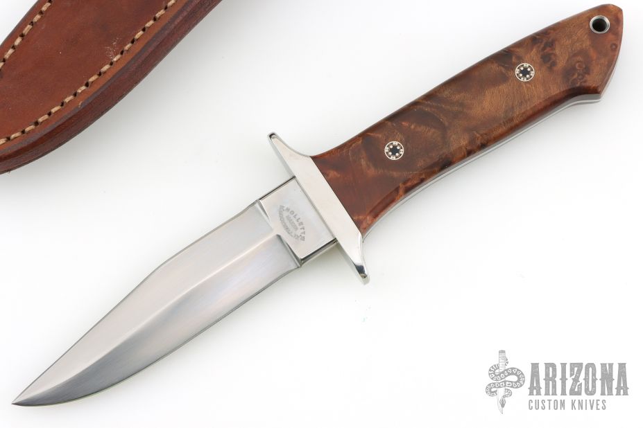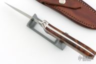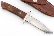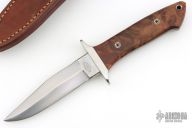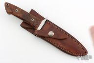 This knife by Jeff Hollett features a hand rub satin finished blade with sharpened top edge, .186" blade stock and 1.084" blade depth, full tapered tang construction. The handle has a stainless steel guard, wood scales with mosaic pin and a lanyard hole. Comes with brown leather sheath. Has some light scratches, otherwise excellent condition.