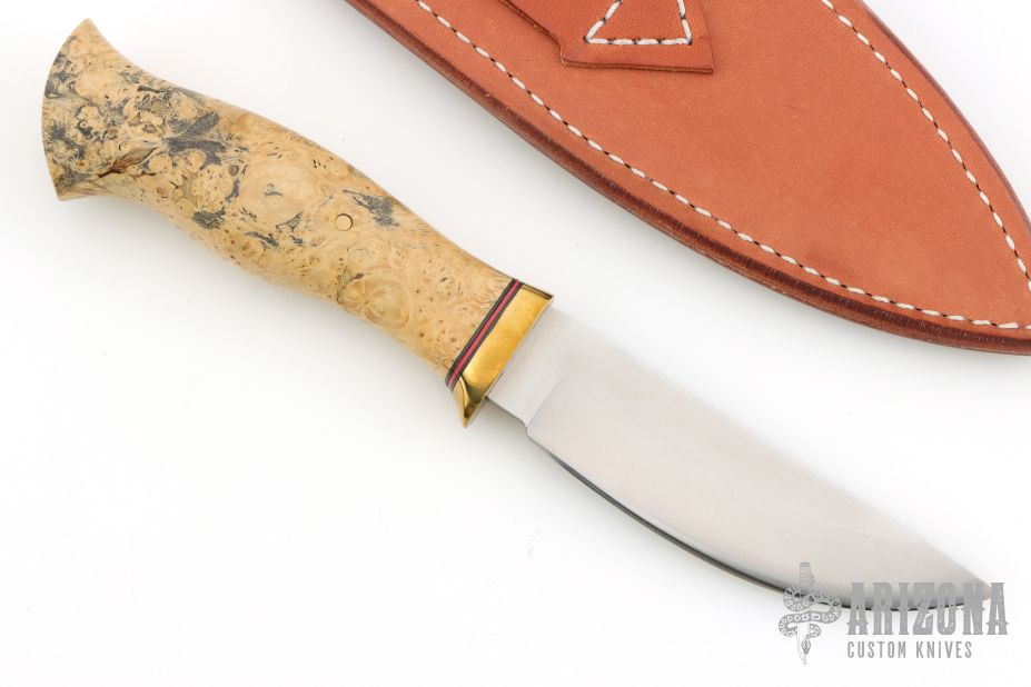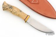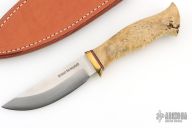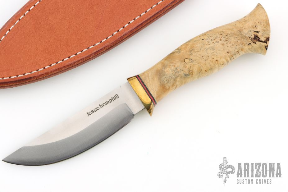 This knife by Jesse Hemphill features a satin finished blade, .124" blade stock and 1.104" blade depth, hidden tang construction. The handle has a brass guard, red/black spacers, box elder burl grip with and a single brass pin. Comes with a brown leather waxed sheath and original box. Excellent condition.