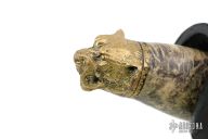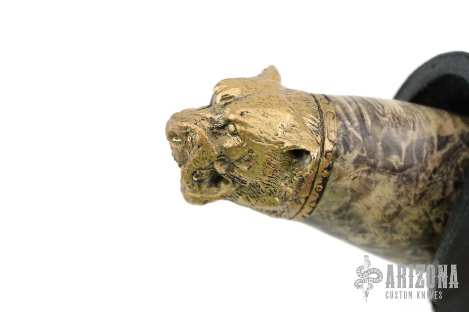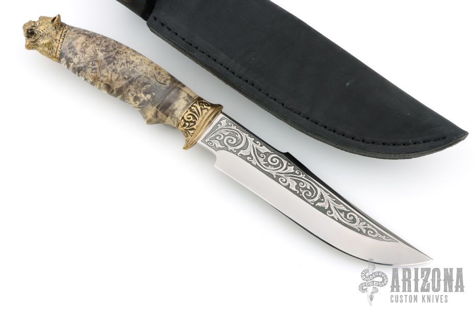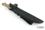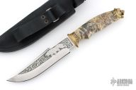 This Hunter from Handcrafted Russian Knives features a satin polished blade with false top edge, etching on the blade, .099" blade stock and 1.512" blade depth, hidden tang construction. The handle has a cast brass guard and pommel with stabilized burl wood grip. Includes a black leather sheath with belt loop and COA. Has a couple very light scratches, otherwise excellent condition.