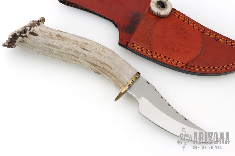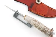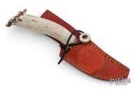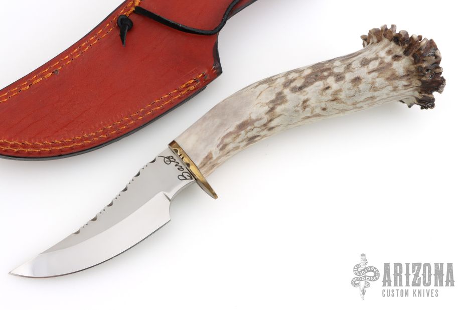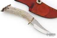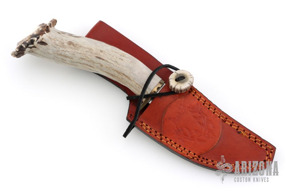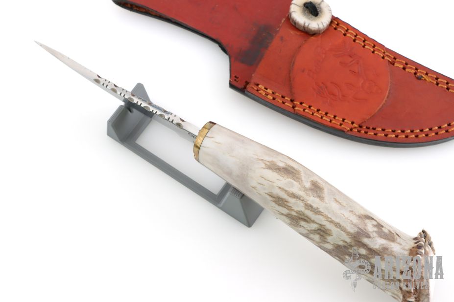 This knife by Ben Barto (Bone Daddy Knives) features a satin polished blade with fileworked spine, .173" blade stock and 1.338" blade depth, hidden tang construction. The handle has a fileworked brass guard and a crown stag grip. Comes with a brown leather sheath. Has some light scratches, otherwise excellent condition.