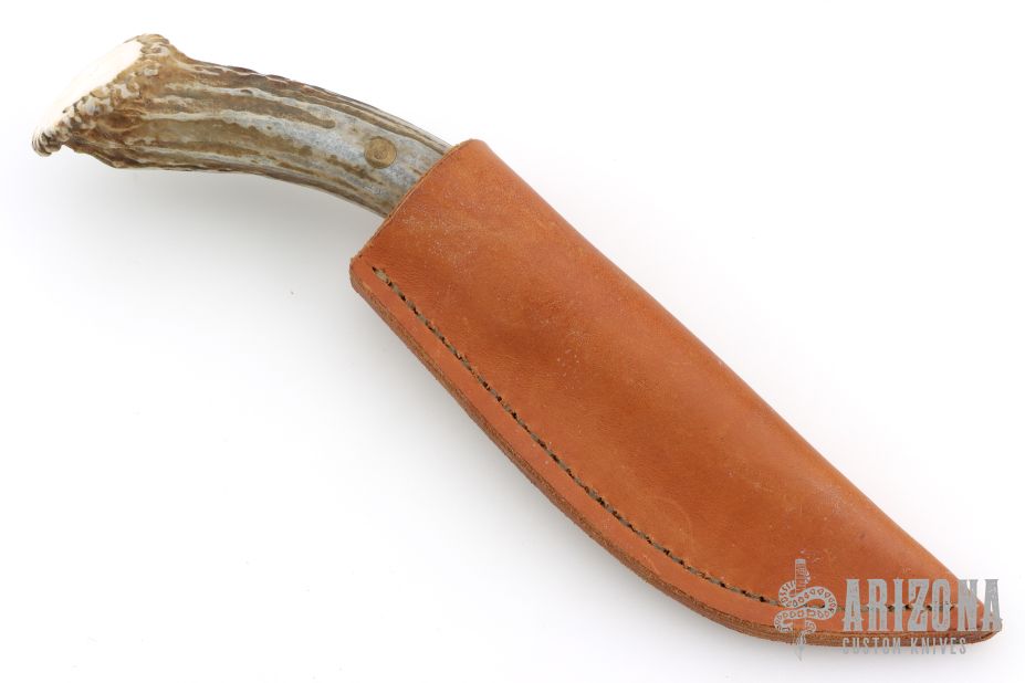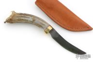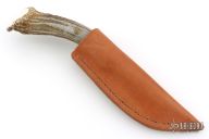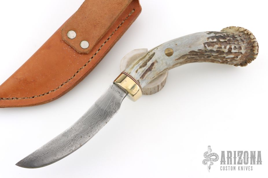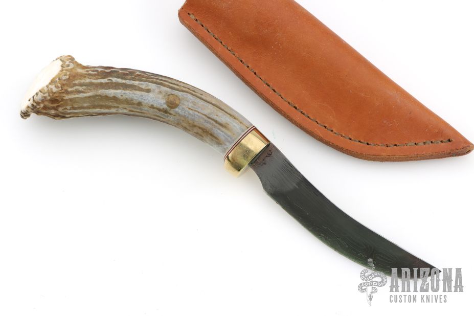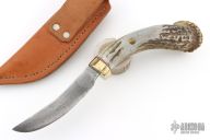 This knife by DJ Hughes features a Damascus blade with .156" blade stock and .911" blade depth, hidden tang construction. The handle has a brass guard and crown stag grip with red/white spacers and a brass pin. Comes with a brown leather sheath. Has some oxidation spots on the blade, otherwise good condition.