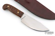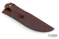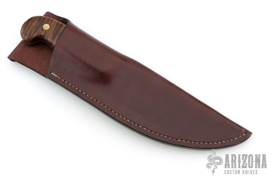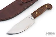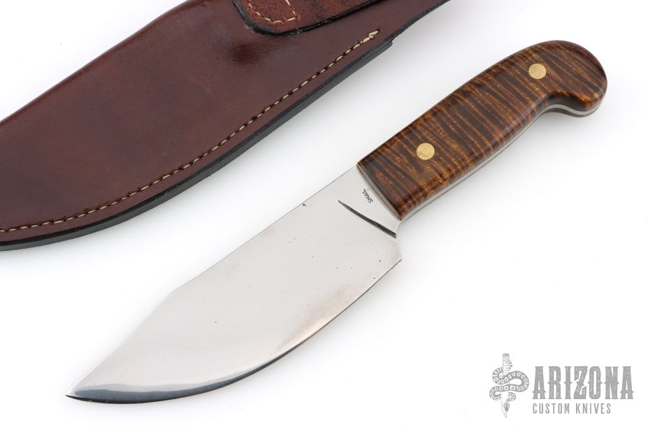 This knife by Smail (please let us know if you know the makers full name) features a mirror polished blade with .228" blade stock and 2.048" blade depth, full tapered tang construction. The handle has curly koa wood scales with brass pins. Comes with a brown leather sheath. Has a few light scratches, and some small oxidation spots, otherwise good condition.
