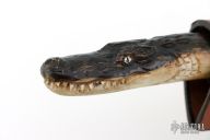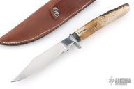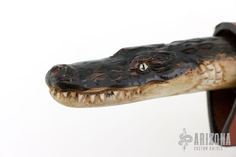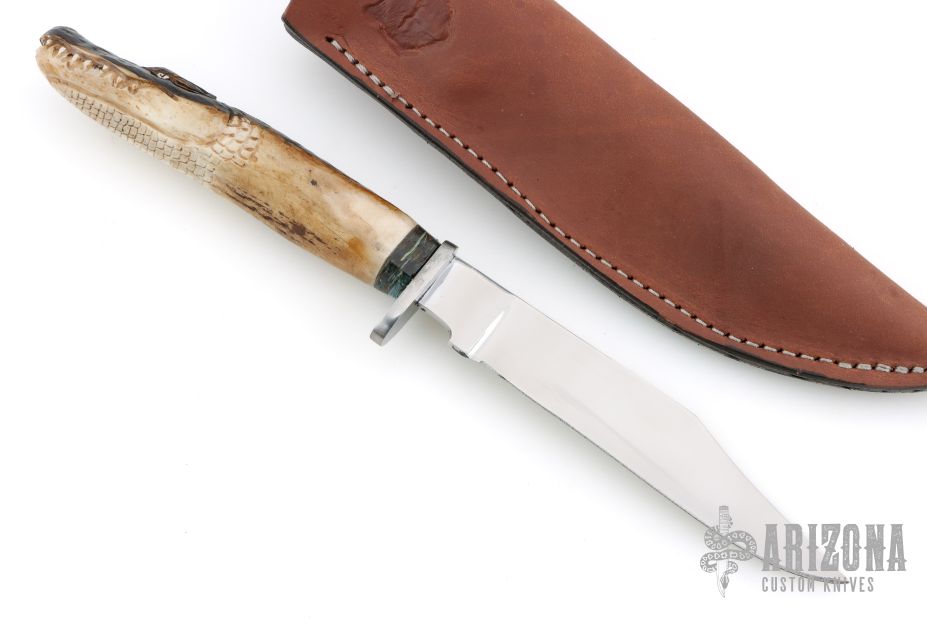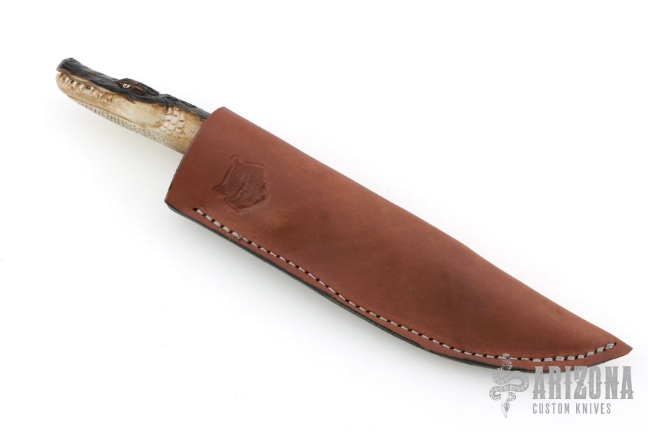 This Hunter by JA Lonewolf features a mirror polished blade with .125" blade stock and .981" blade depth, hidden tang construction. The handle has a steel guard, stag grip with carved gator head on the butt. Excellent condition. Comes with a brown leather sheath.