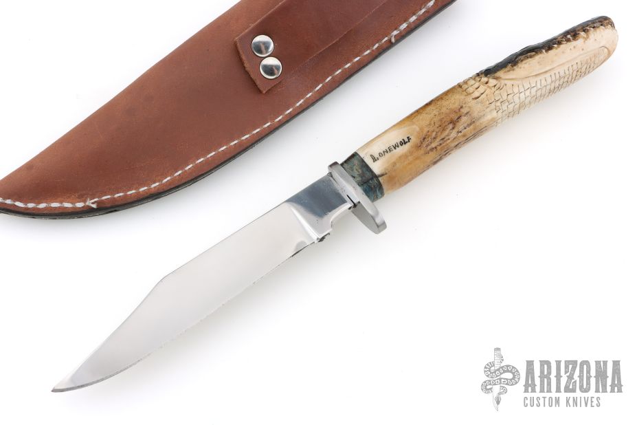 "Lonewolf and Sons was founded by J.A. Lonewolf over 20 years ago. He is an artisan who skillfully combines the blacksmith trade with illustration, sculpture, and scrimshaw. This combination has created his high end art of knife making. Each piece is original. No two works are the same, even repeated orders. Specializes in high-art working and using straight knives of his own design, particularly Bowies, hunters, camp/utility and fine steel blades. Forges Damascus and high-carbon steel."
