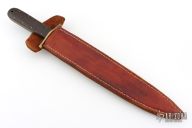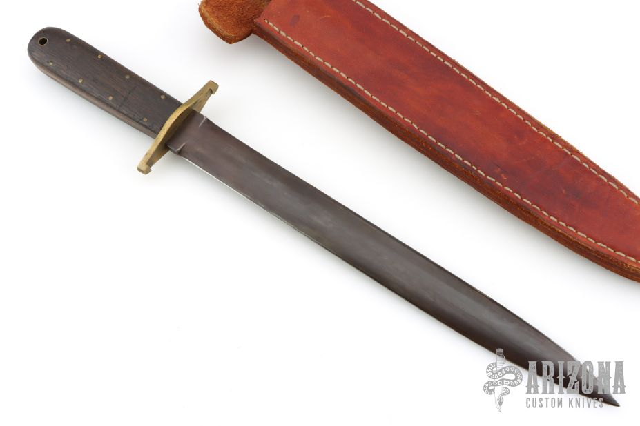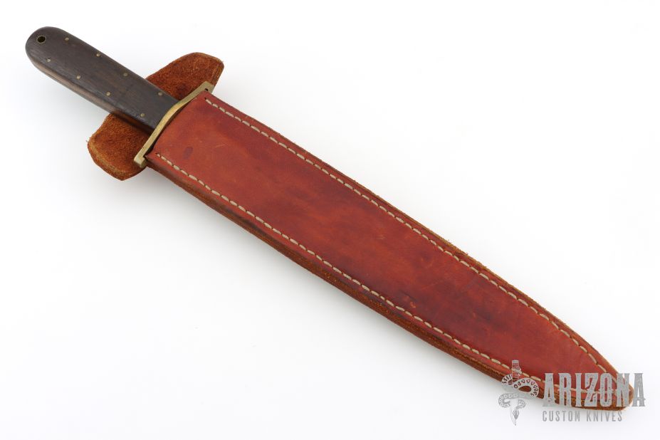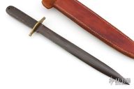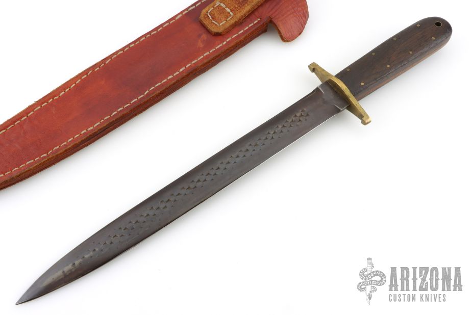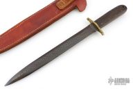 This Dagger by Herb Derr features a blued double edged blade made from a farrier's rasp, .209" blade stock and 1.215" blade depth, hidden tang construction. The handle has a brass guard and a wood grip with brass pins. Includes a brown leather sheath. Has some minor patina, otherwise excellent condition.