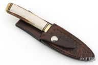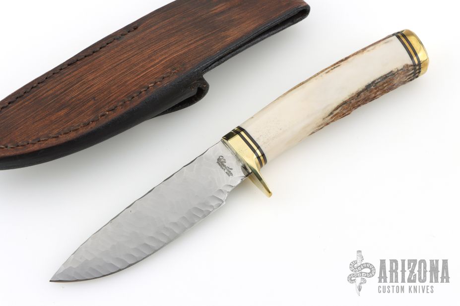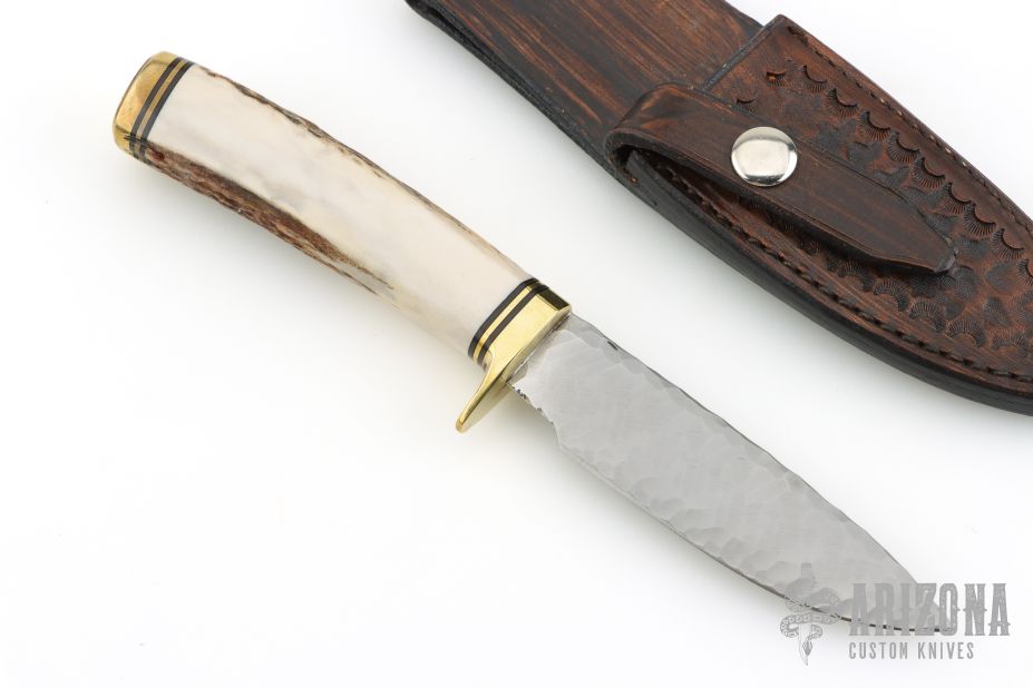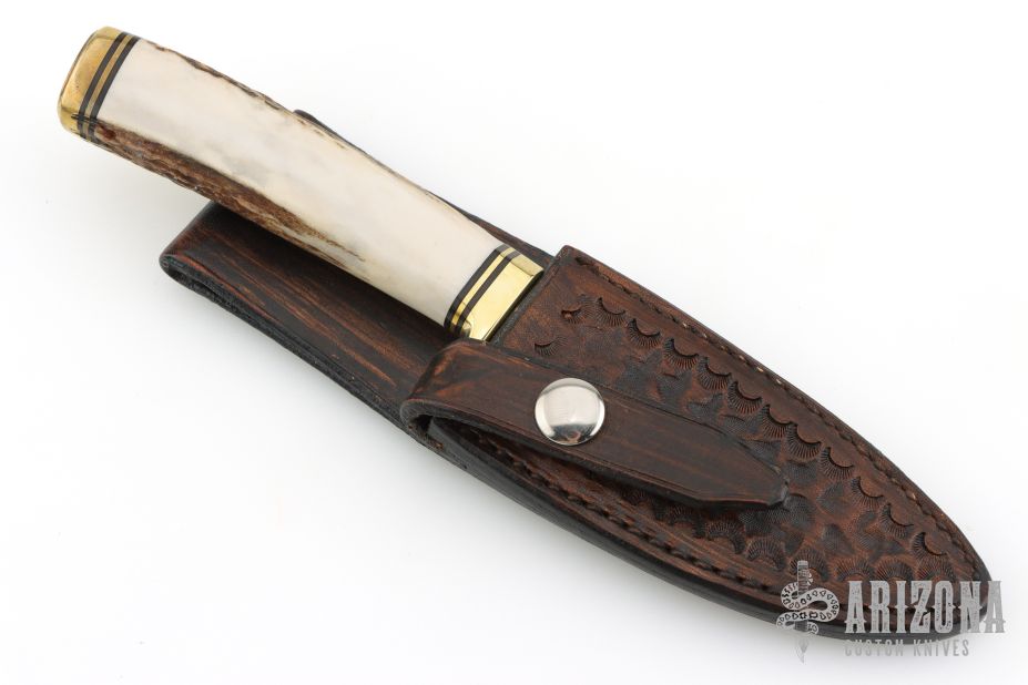 This custom fixed blade by Bill Cheatham features a "Knapped" drop point style blade, .127" blade stock and 1.111" blade depth, hidden tang construction. The handle has a brass guard and butt, a stag grip with a black/brass spacers. Comes with a hand tooled brown leather sheath. Excellent Condition.