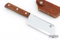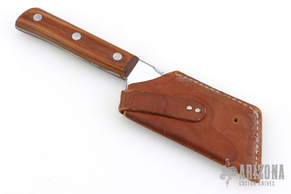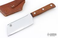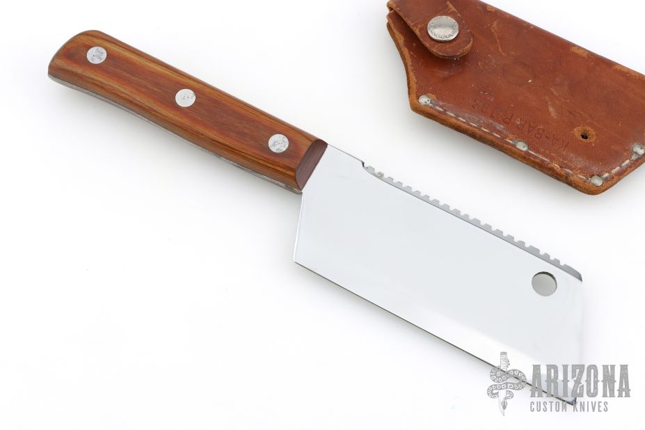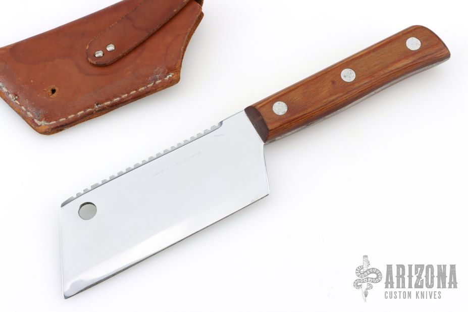 This Cleaver by Ka-Bar features a mirror polished sheepsfoot blade with notched thumbrest, .137" blade stock and 1.952" blade depth, full tang construction. The handle has laminated wood scales. Comes with a brown leather sheath. Has light scratches, otherwise excellent condition.