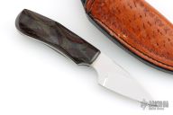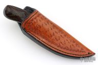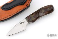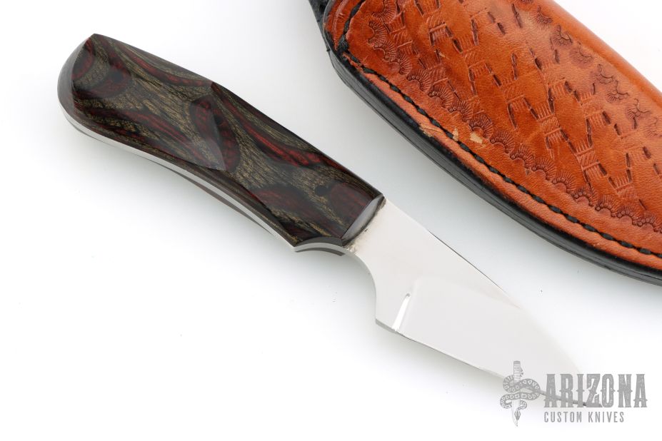 This knife (please let us know if you know who this maker is) features a mirror polished blade with .129" blade stock and 1.082" blade depth, full tang construction with laminated wood scales. Comes with a hand tooled brown leather sheath. Excellent condition.