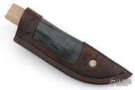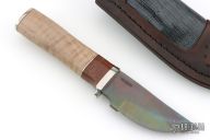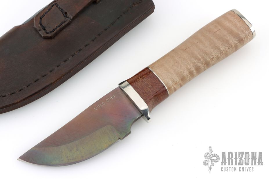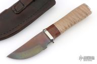 This hunter by Herb Derr features a bronzed blade with .156" blade stock and 1.450" blade depth, hidden tang construction. The handle has a nickel silver guard and butt, curyl maple grip, brown canvas micarta and nickel silver spacers. Includes a brown leather sheath with lizard skin and a MDKC medallion. Excellent condition.