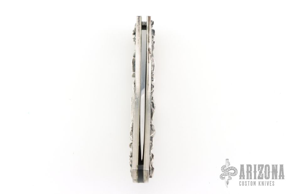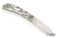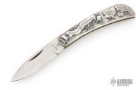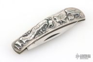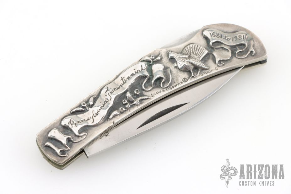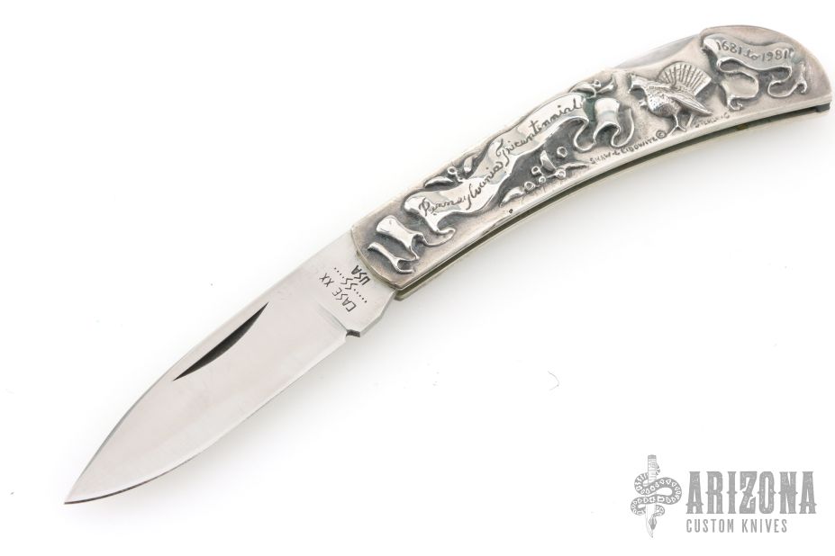 This vintage Case lockback features a satin finish blade marked Case XX USA with nine dots. The handle has cast sterling silver covers by Shaw-Leibowitz, nickel silver liners, steel rocker bar, and black fiber backspacer. Comes in a felt pouch. Excellent condition. #27 of 300