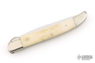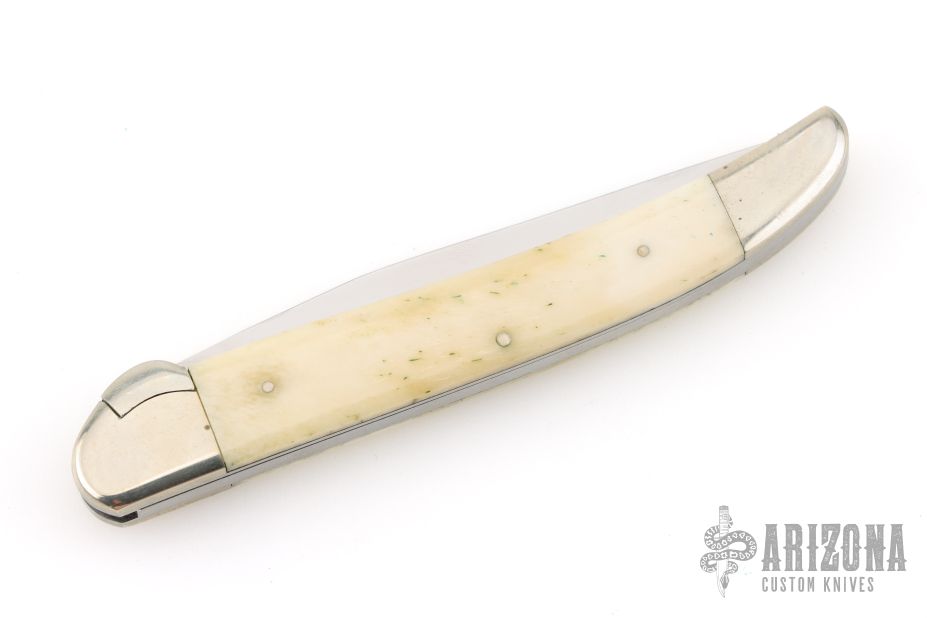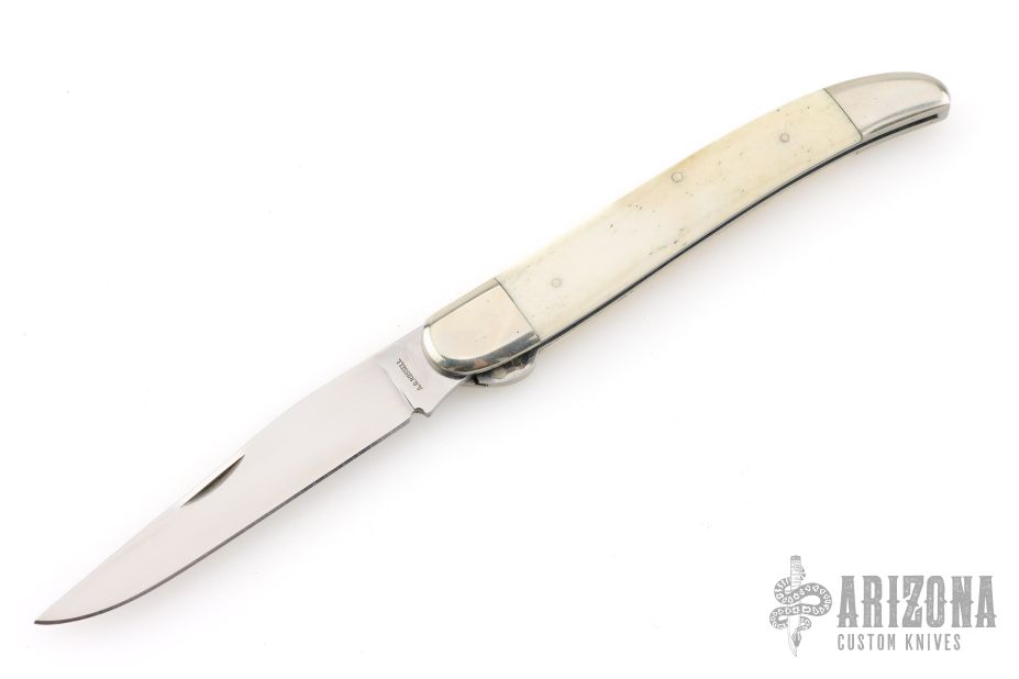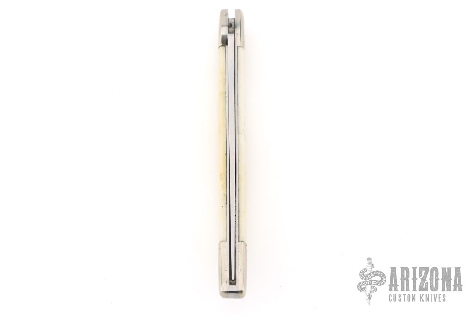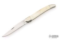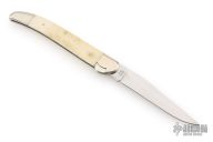 This knife from AG Russel features a mirror polished blade with nail nick. The handle has nickel silver bolsters, front and rear, bone scales, and stainless steel liners. Comes with original box. Excellent condition.