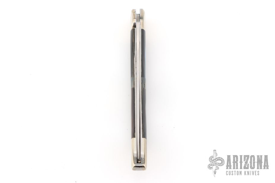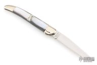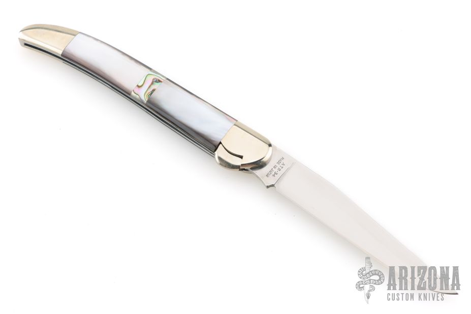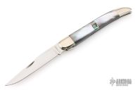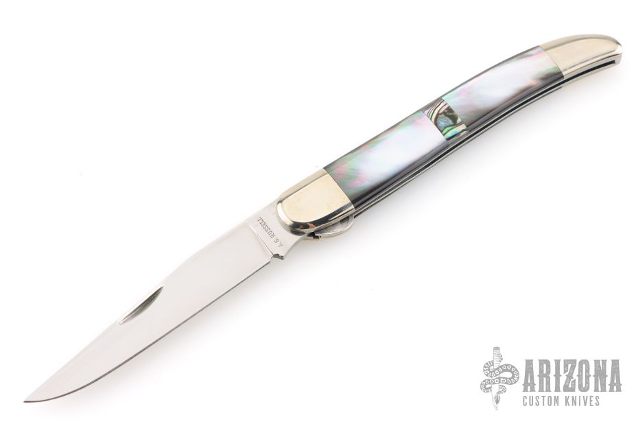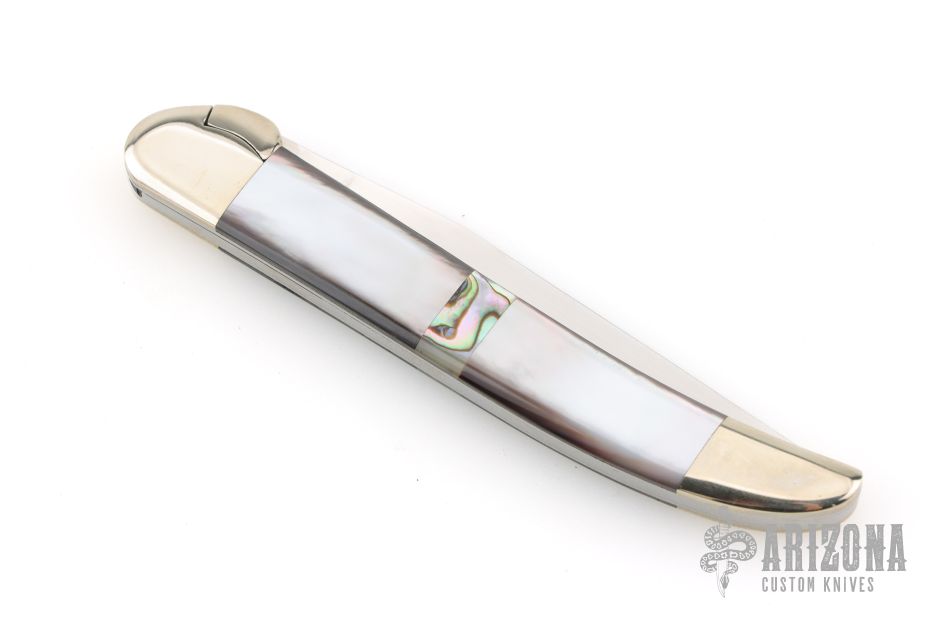 This knife from AG Russel features a mirror polished blade with nail nick. The handle has nickel silver bolsters, front and rear, black lip pearl and abalone inlays, and stainless steel liners. Includes the original box.  Excellent Condition.