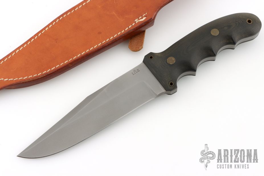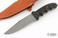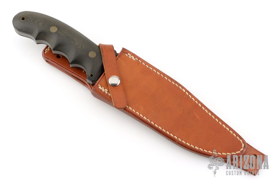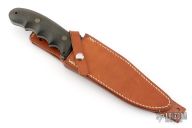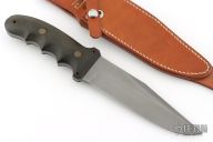 This Grey Ghost features a bead blasted clip point blade with a sharpened top edge, .255" blade stock and 1.586" blade depth, full tang construction. The handle has black linen micarta scales with brass pins and lanyard hole. Nice finger contours for comfort and grip. Comes with a brown leather sheath. Excellent condition.