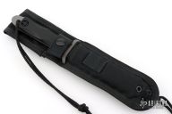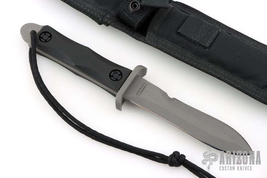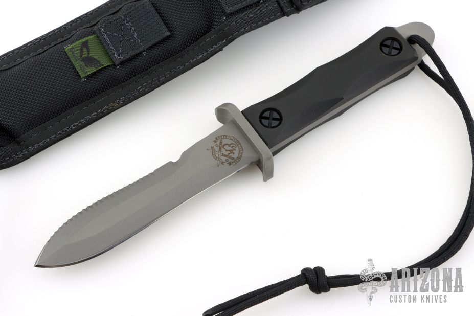 This Dive Knife by EK Knives features a bead blasted blade with serrated top edge, .237" blade stock and 1.085" blade depth, full tang construction. The handle has a stainless steel guard with black scales. Comes with a black nylon sheath. Excellent condition. Rare.
