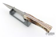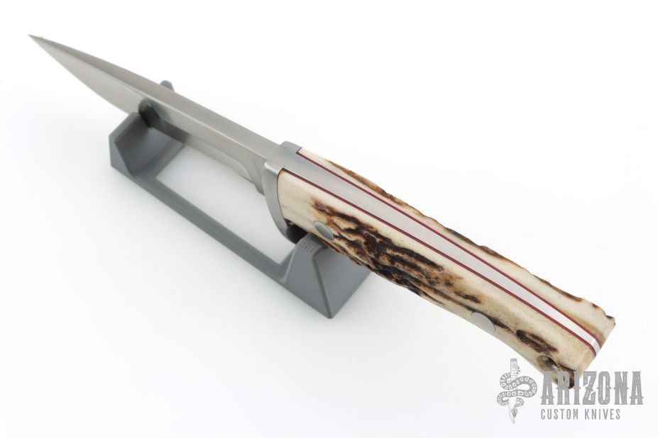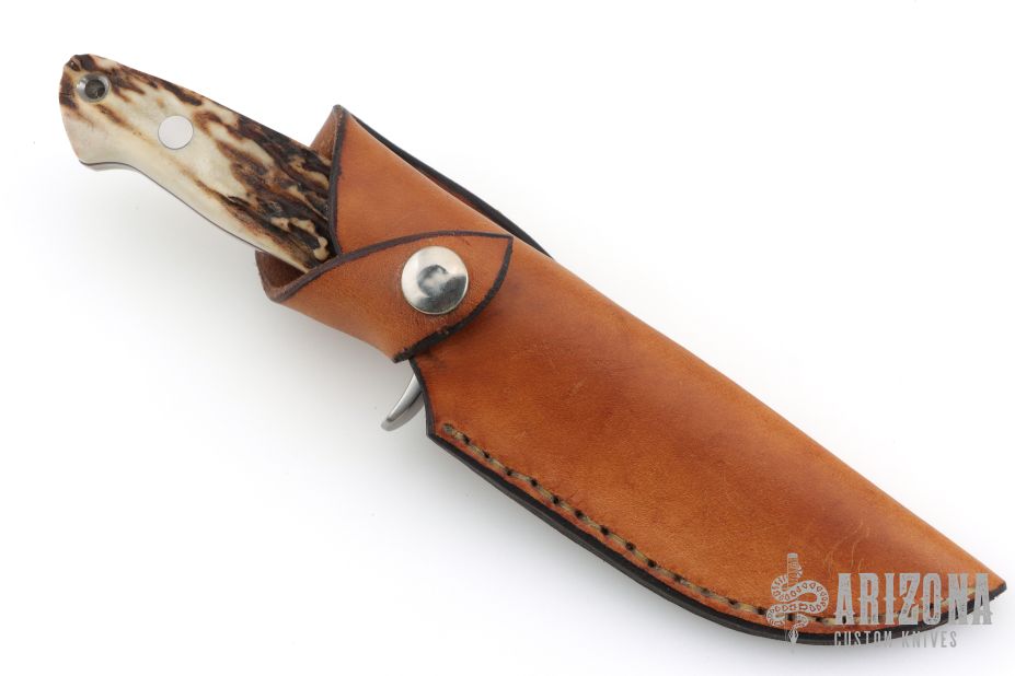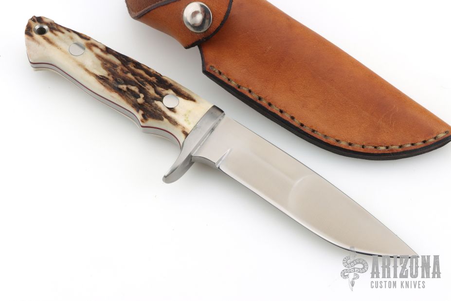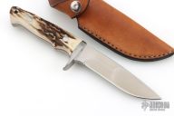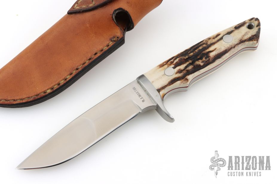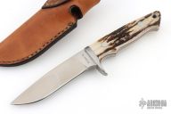 This hunter by RJ Martin features a satin finished blade with Duplex grind, .246" blade stock and 1.044" blade depth, full tapered tang construction. The handle has a stainless steel guard with stag scales, red liners and stainless steel pins. Comes with a brown leather sheath. Excellent condition.