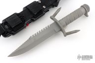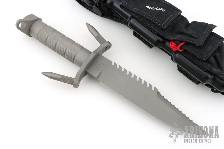 This is an early Buckmaster 184, made prior to full blade being marked with BUCKMASTER and while it was patent pending, hard to find. Has a clip point blade with serrated top edge and saw teeth on spine, .287" blade stock and 1.488" blade depth. The handle has a stainless steel guard, knurled handle and removable butt cap. Comes with original sheath. Includes original grappling hooks that are stored in the sheath along with a compass. Has a couple light sheath scratches, otherwise excellent condition. Made between November 1984 - July 1985.