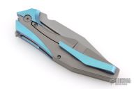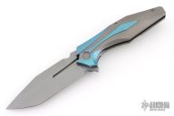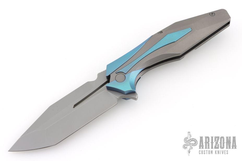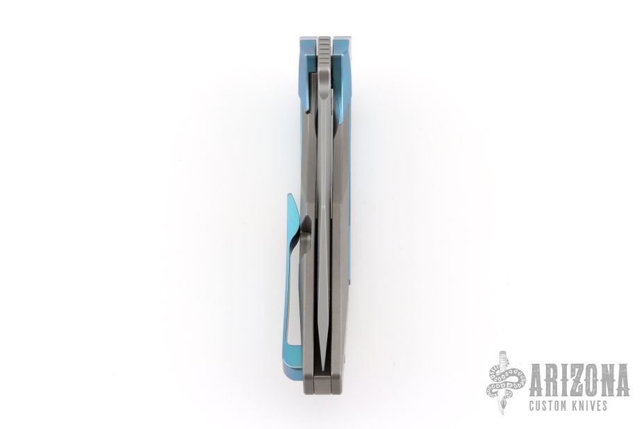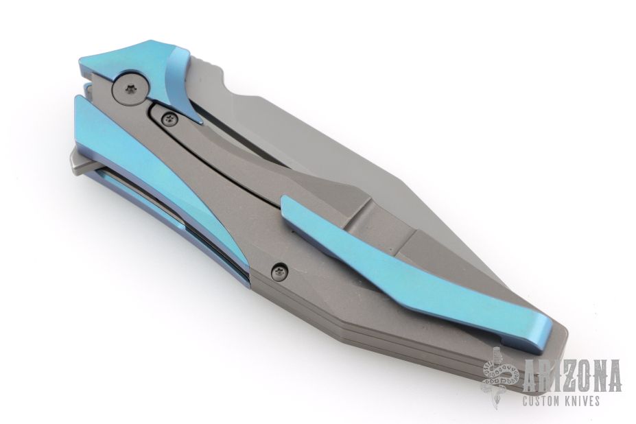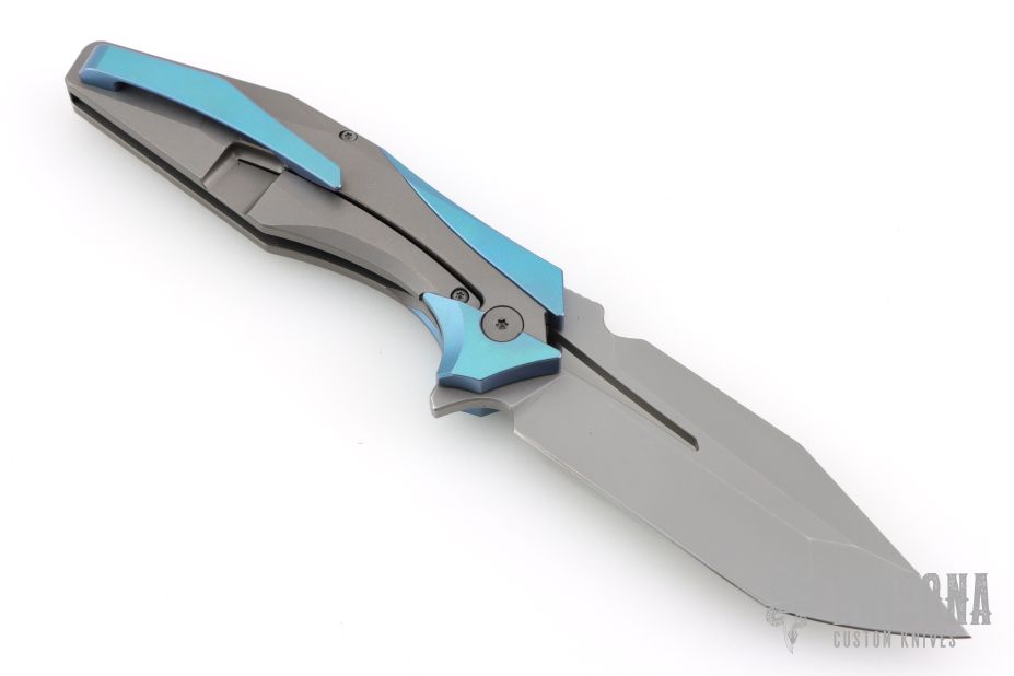 This one has a satin finished blade with notched thumbrest and flipper. the handle has a bead blast titanium frame with anodized titanium accents. Comes with original box, papers, and zippered case. Excellent condition.
