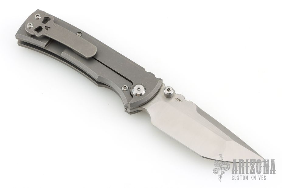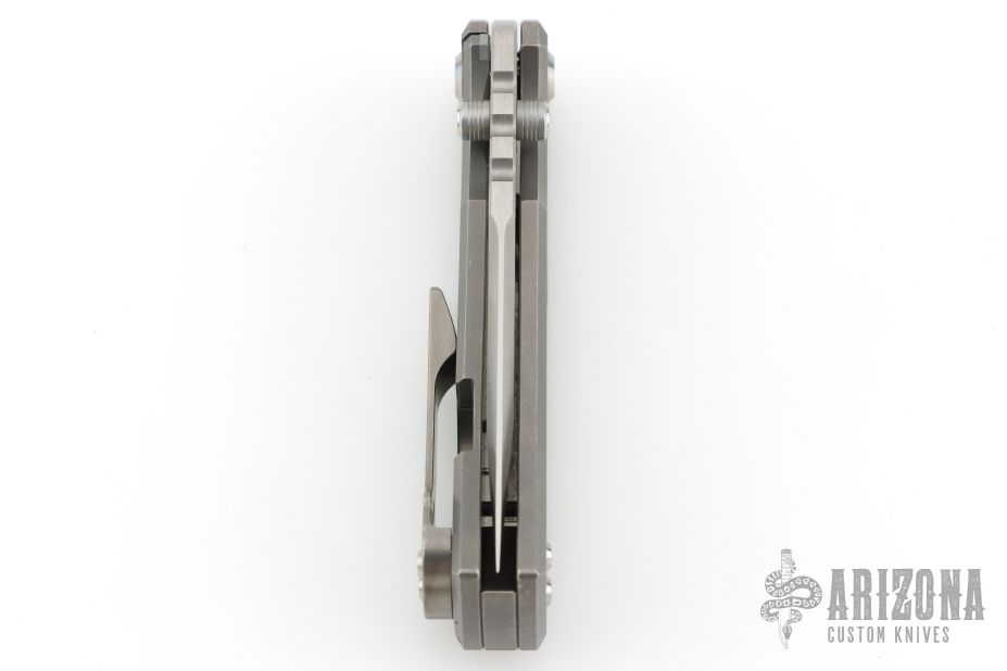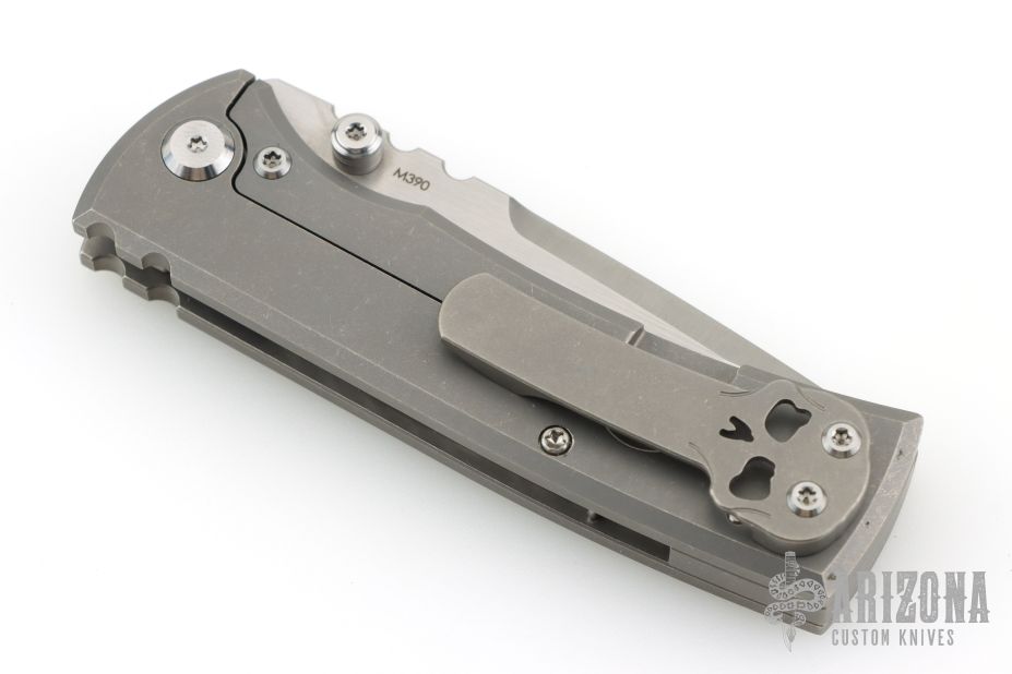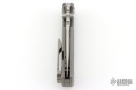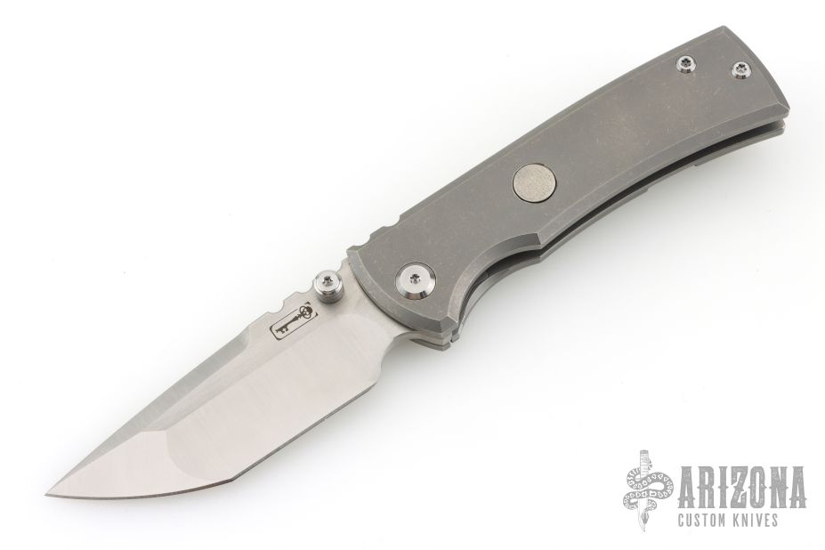 This Chaves Ultramar Redencion Tanto features a satin finished blade with the Chaves logo, dual thumbstuds, and notched thumbrest. The handle is made up of tumbled titanium, skull pocket clip (positioned for tip up carry), and a matching titanium backspacer. Has overtravel stop. Blade is centered when closed, and locks up with no play. Comes with box and additional clip. This one has been converted to a D/A Auto by Kyle Vallotton. Excellent condition.