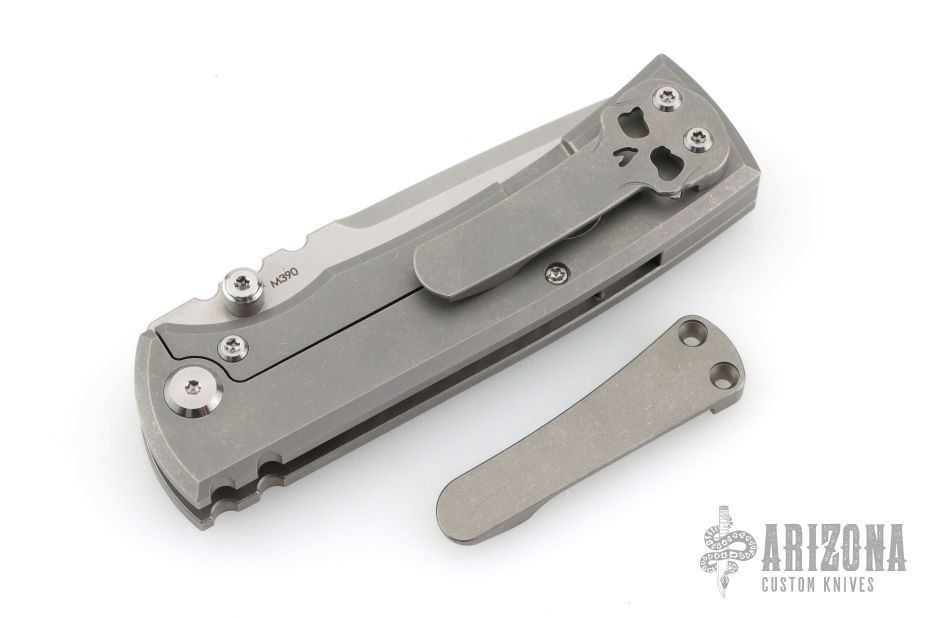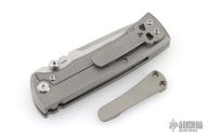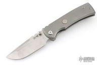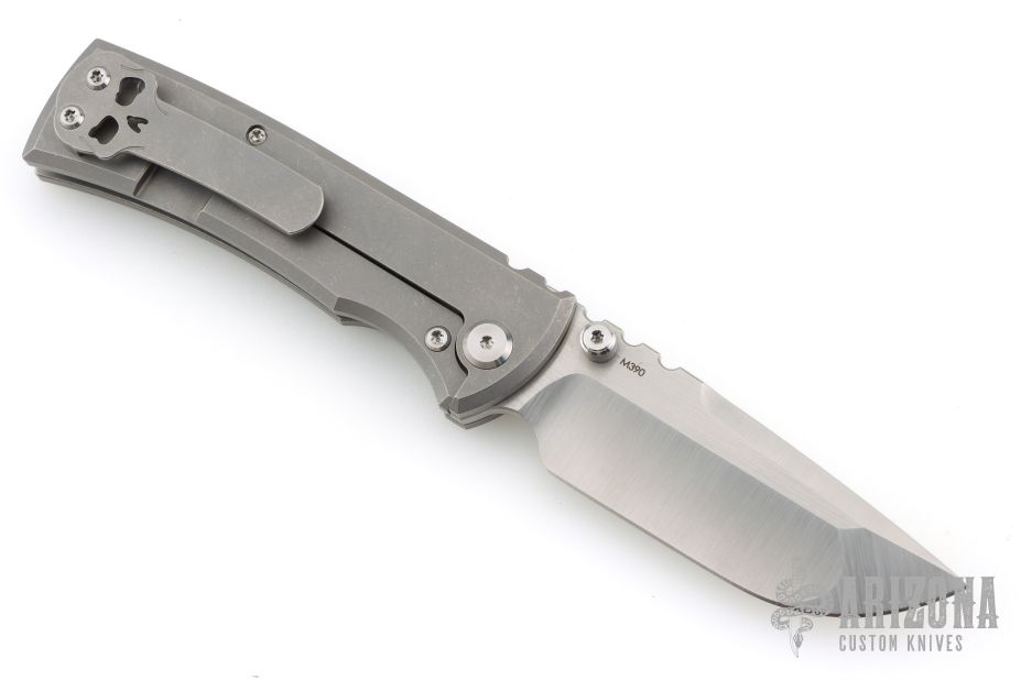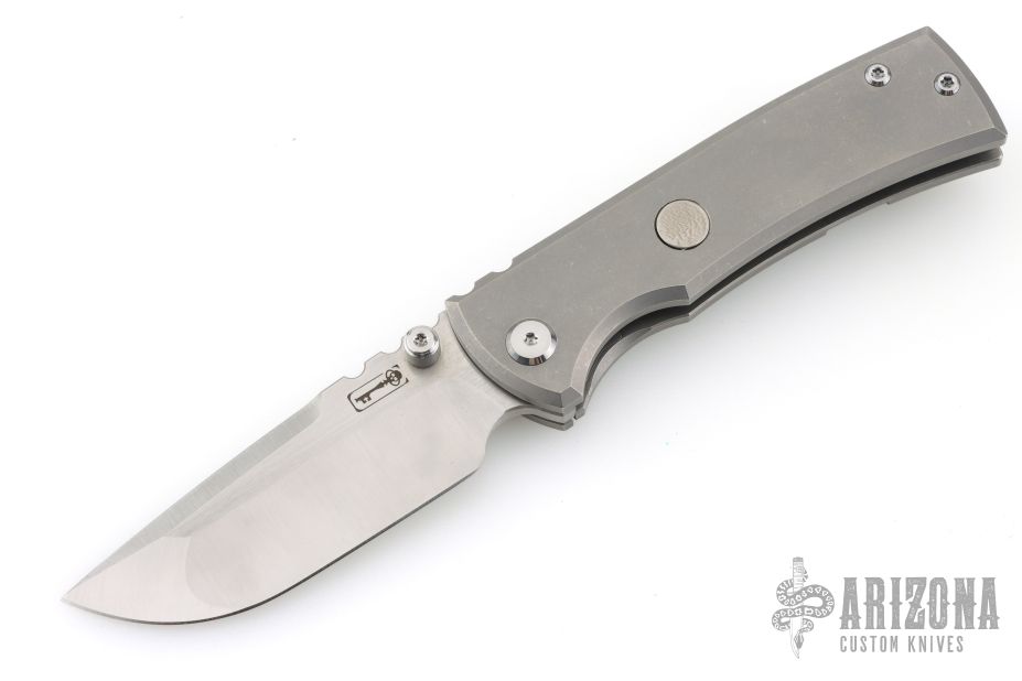 This Chaves Ultramar Redencion Drop Point features a satin finished blade with the Chaves logo, dual thumbstuds, and notched thumbrest. The handle is made up of tumbled titanium, skull pocket clip (positioned for tip up carry), and a matching titanium backspacer. Has overtravel stop. Blade is centered when closed, and locks up with no play. Comes with box and additional clip. This one has been converted to a D/A Auto by Kyle Vallotton. Excellent condition.