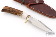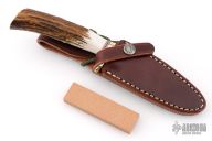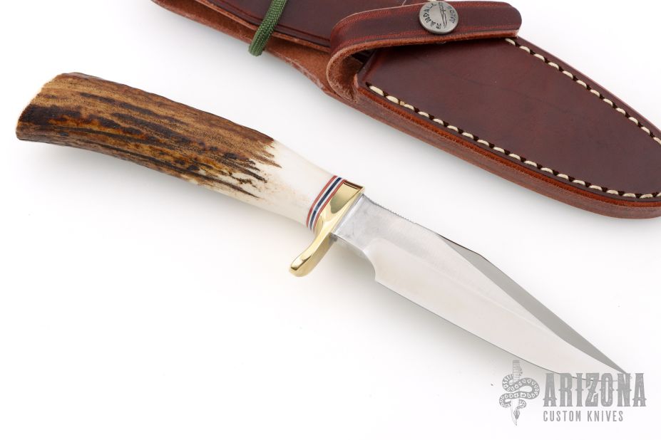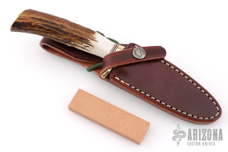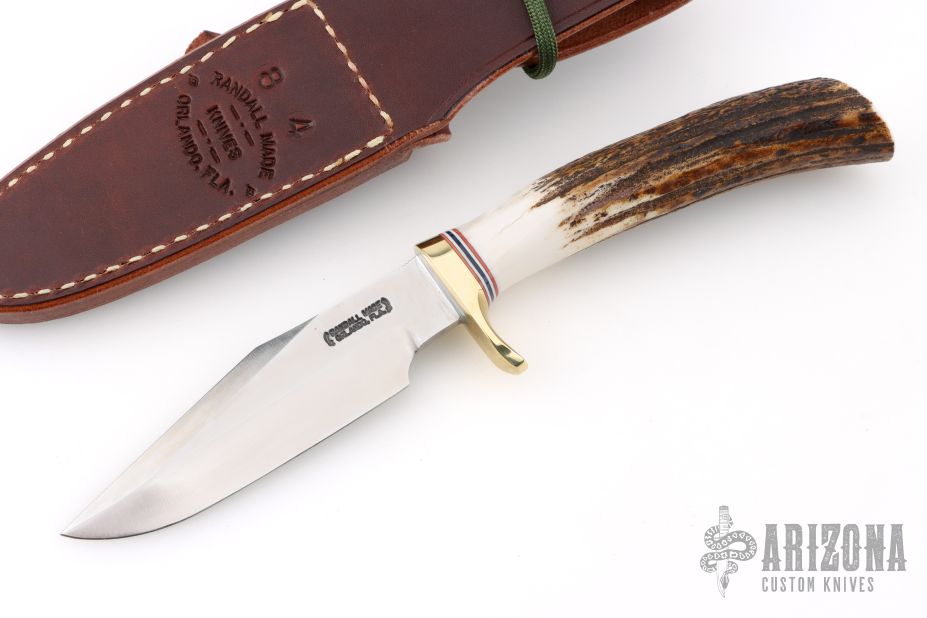 This Model 8-4 by Randall Made Knives features a satin finished blade with sharpened top edge and notched thumbrest, .154" blade thickness, 1.083" blade depth, hidden tang construction. Especially suitable for small fish and feathered game. The handle has a brass guard and stag grip with red/white/blue spacers. Comes with a brown leather sheath and original paper wrapping. New from maker.