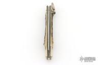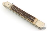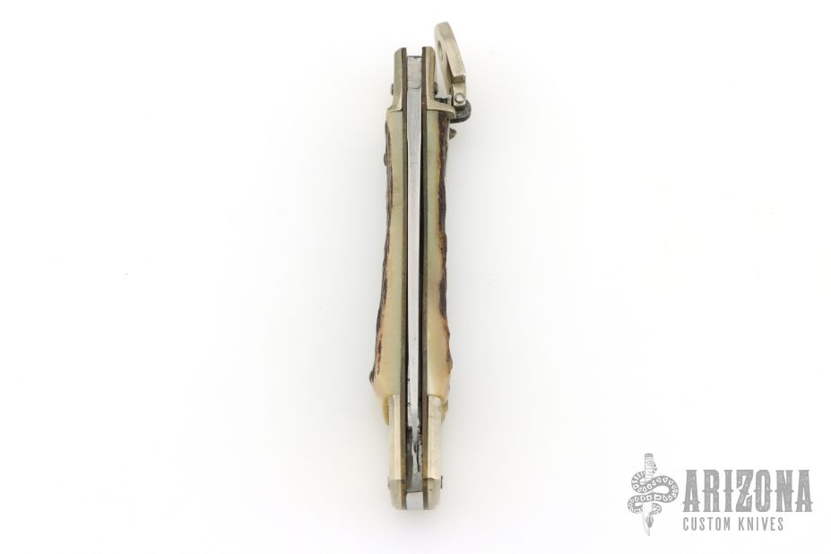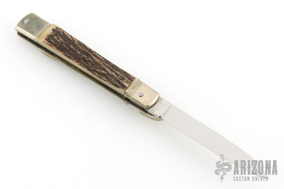 This Lever Lock Automatic by Hubertus Knives features a polished drop point blade. The handle is comprised of nickel silver double bolster and lever with stag scales over brass liners and steel backspacer. Has some light scratches, otherwise excellent condition.